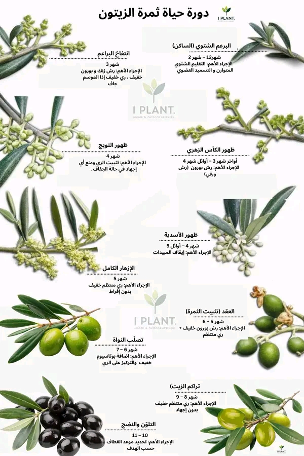 🫒 دورة حياة ثمرة الزيتون : القرار الصحيح في كل مرحلة = محصول وفير 💚كثير مزارعين بيخدموا الزيتون طول السنة …وبالأخير يقولك : ليش المحصول خفيف ؟ 🤷♂️السبب ببساطة 👇 كل مرحلة من حياة ثمرة الزيتون إلها إجراء واحد صحيح وقرار .وأي خطأ بالتوقيت … ثمنه يُدفع عند القطاف.خلّينا نمشي على الصورة مرحلة مرحلة 👇🌱 البرعم الشتوي (شهر 12 –شهر 2 ) القرار : تقليم شتوي متوازن وتسميد عضوي .نحسن التربة و نجهّز الشجرة للإزهار ، لا نرهقها ولا نتركها فوضى………..🌱 انتفاخ البراعم ( شهر 3 ) القرار : رش زنك ( اساسي ) + بورون خفيف ( يمكن بدونه ) . وري خفيف في حالة ” الجفاف ” .هون بتتحدد قوة الأزهار من الأساس ………..🌼 ظهور الكأس الزهري ( نهاية شهر 3 – أوائل 4 ) القرار : بورون ورقيمرحلة حساسة لتكوين زهرة سليمة قابلة للعقد………..🌼 ظهور التويج (شهر 4 ) القرار : تثبيت الرطوبة بالري الخفيف ( ان وجد ) ومنع أي إجهادأي عطش أو صدمة = زهور بلا ثمار………..🌼 ظهور الأسدية (شهر 4 – أوائل 5 ) القرار : إيقاف المبيدات حماية حبوب اللقاح = عقد أفضل………..🌸 الإزهار الكامل ( شهر 5 ) القرار : ري خفيف منتظم (للمروي فقط)لا إفراط… ولا تعطي الشجرة صدمة………..🫒 العقد – تثبيت الثمرة ( شهر 5 – 6 ) القرار: بورون خفيف + ري منتظم (إن وُجد)هون القرار ذكي:✔️ البورون يدعم انقسام الخلايا❌ البعض يعطي نيتروجين “ممكن يضر خصوصًا بالبعلي ” ………..🫒 تصلّب النواة (شهر 6 – 7 ) القرار : بوتاسيوم خفيف + تركيز على الريالنواة تقسى، وعدد الثمار النهائي يتثبت………..🫒 تراكم الزيت (شهر 8 – 9 ) القرار : ري منتظم بدون إجهادأهم مرحلة لكمية وجودة الزيت………..🫒 التلوّن والنضج (شهر 10 – 11 ) القرار: تحديد موعد القطاف حسب الهدفزيت مبكّر = جودة أعلىمتأخر = كمية أكثر……….🌧️ ملاحظة مهمة:الزيتون البعلي يُدار بإدارة الإجهاد لا بالإكثار من التسميد .الزيتون المروي نتحكم فيه بالماء والتغذية… بحذر📌 العلم واحد، التطبيق يختلف………………………….🧠 الخلاصة:80٪ من نجاح محصول الزيتون يتحدد بين انتفاخ البراعم ونهاية تراكم الزيت…وأي خطأ بهالفترة ما بتصلّحه لا معصرة ولا دعاء ………………………….لا تنسوا التفاعل و متابعة صفحتنا للمزيد 💚💾احتفظ بالمنشور والصورة كدليلك لكل مرحلة من حياة الزيتون!#زيتون #دورة_حياة_ثمرة_الزيتون #زيتون_بعلي #زراعة_ذكية #Iplant# مجلة ايايت فوتو ارت