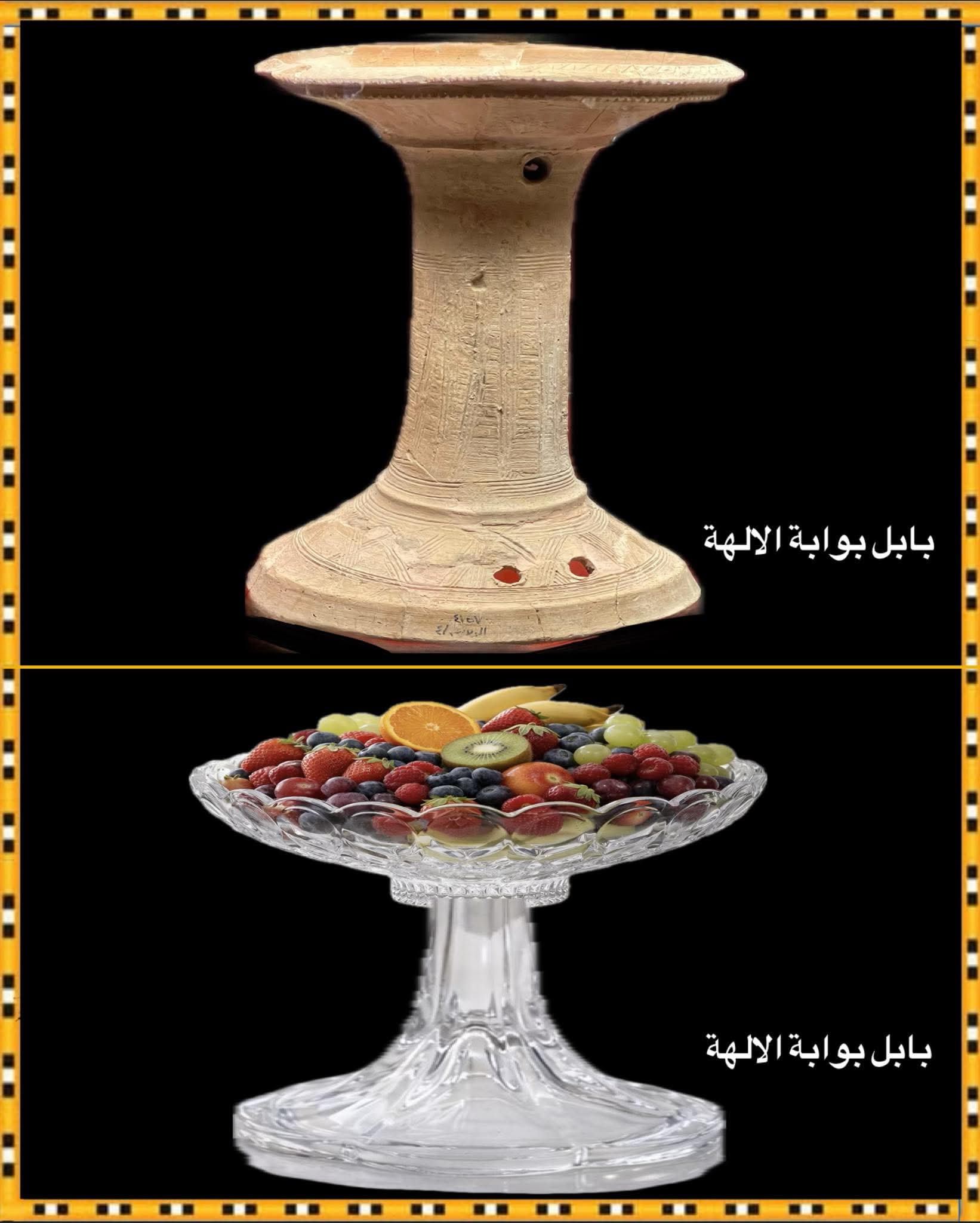 في الصورة العلوية نرى حامل فاكهة مصنوع من الفخار له قاعدة سفلية مرتفعة أسطوانية الشكل ومزخرفة بأشكال هندسية، وقد عُثر عليه في موقع كيش ويعود تاريخه للعصر السومري القديم بحدود الفترة ما بين (2900-2370) عام قبل الميلاد.والفكرة نفسها لا نزال نستخدمها في وقتنا الحالي ، اذ نقدم الفاكهة على إناء يشبه حامل الفاكهة السومري الأصيل بقدمه، كما هو موضح في الصورة إلى الاسفل.فهل يمكنكم تخيل مدى التمدن والتحضر الذي عاشه سكان بلاد الرافدين قبل ما يقارب 5000 عام! حامل الفاكهة الفخاري موجود حالياً في متحف البصرة الحضاري# بابل بوابة الالهة.# م٠لة ايليت فوتو ارت.