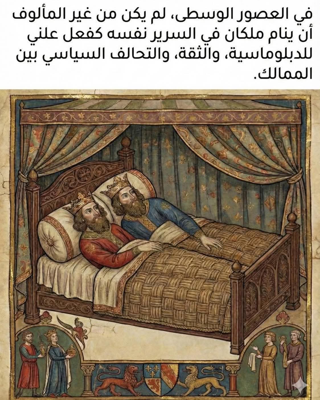 🛏👑دبلوماسية الوسائد: عندما كان “سرير الملك” ساحة للتحالفات السياسية تخيل المشهد اليوم: رئيسان لدولتين عظميين يعقدان قمة سياسية، وبدلاً من المصافحة الرسمية أمام الكاميرات، يختتمان يومهما بالنوم جنباً إلى جنب في سرير واحد مزدوج! سيبدو الأمر صادماً وربما فضيحة في عالمنا المعاصر، أليس كذلك؟لكن الصورة التاريخية التي بين أيدينا تأخذنا في رحلة عبر الزمن إلى العصور الوسطى، لتكشف لنا عن منطق مختلف تماماً للعلاقات الدولية، حيث كانت “الحميمية العلنية” أداة سياسية قوية.لماذا السرير تحديداً؟في تلك العصور الغابرة، لم يكن مفهوم “الخصوصية” كما نقدسه اليوم موجوداً، خاصة للملوك. كانت حياة الملك استعراضاً دائماً للقوة والسلطة، حتى في لحظات نومه.في عالم يعج بالمؤامرات، والاغتيالات بالسم أو الخنجر، تعتبر لحظة النوم هي اللحظة الأكثر ضعفاً وتجرداً للإنسان. هنا تكمن عبقرية الرمزية في هذا الطقس الغريب:عندما يوافق ملك قوي على مشاركة سريره مع ملك آخر، فهو يرسل رسالة مدوية لا لبس فيها لشعبيهما وللعالم: “نحن نثق ببعضنا البعض ثقة عمياء تصل لدرجة أن ننام عزلاً من السلاح بجوار بعضنا البعض”.لم يكن الأمر يتعلق بالراحة الجسدية، بل كان أقصى درجات التعبير المسرحي عن “الأمان” و”التحالف الاستراتيجي”. كان السرير في تلك اللوحة بمثابة طاولة المفاوضات النهائية، وتقاسم الغطاء هو التوقيع الأخير على معاهدة السلام.تذكرنا هذه العادة القديمة بأن قراءة التاريخ تتطلب منا دائماً خلع “نظاراتنا الحديثة”. فما نراه اليوم غريباً أو مستهجناً، كان في زمن آخر قمة الدبلوماسية وذروة الثقة السياسية بين الإمبراطوريات. # الموسوعة النظرية# مجلة ايليت فوتو ارت