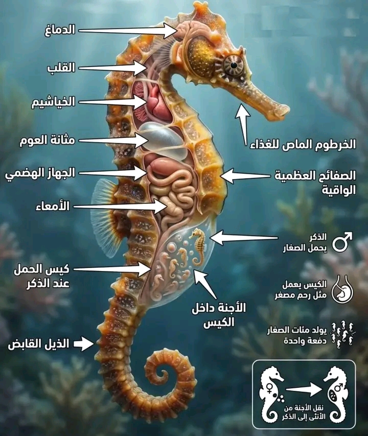 فرس البحر واحد من أغرب الكائنات البحرية، مش بس بسبب شكله، لكن بسبب تركيبه الداخلي ونظام التكاثر الفريد اللي بيخليه حالة استثنائية في عالم الحيوان.🔬 التشريح الداخلي لفرس البحر رغم صغر حجمه، جسمه يحتوي على نظام داخلي مميز:هيكل عظمي خارجي بدل القشور، مكوَّن من صفائح عظمية تحمي الجسم.مثانة عوم كبيرة تساعده يفضل ثابت في المياه بدل السباحة السريعة.جهاز هضمي بسيط لأنه ما عندوش معدة حقيقية، فبيحتاج ياكل بشكل شبه مستمر.خطم طويل يعمل زي شفاط يسحب الكائنات الصغيرة بسرعة.ذيل قابض يمسك به النباتات البحرية لتثبيت نفسه ضد التيارات.🤯 أغرب ظاهرة: الذكر هو اللي بيحمل!الميزة الأكثر غرابة:الأنثى تضع البيض داخل كيس خاص في بطن الذكر.الذكر يقوم بتخصيب البيض داخليًا.الكيس يعمل مثل رحم مصغر يوفر الأكسجين والأملاح والغذاء للأجنة.بعد اكتمال النمو، الذكر يمر بعملية ولادة حقيقية يخرج فيها الصغار للماء.يعني فعليًا: الحمل والولادة هنا مسؤولية الذكر، مش الأنثى.🌍 لماذا هذا مهم علميًا؟دراسة فرس البحر تساعد العلماء على فهم:تطور أنظمة التكاثر عند الكائنات تنوع طرق الحمل في الطبيعة تكيف الكائنات البحرية مع بيئات صعبة# عالم المعرفة # مجلة ايليت فوتو ارت.