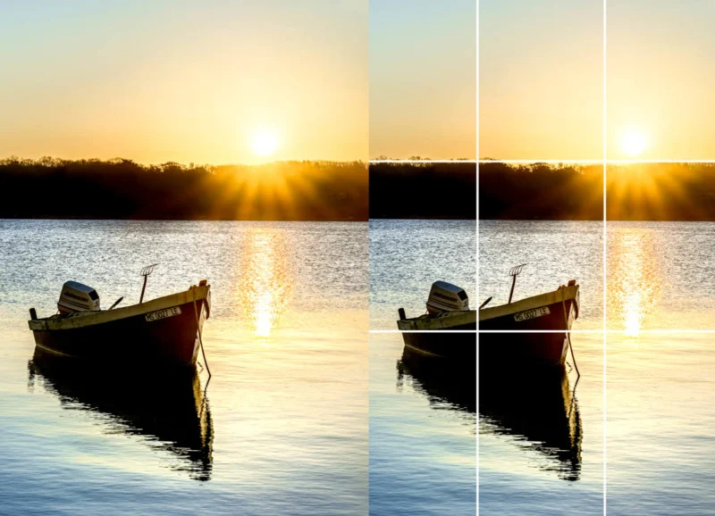 قد تبدو التركيبة التي يوضع فيها الموضوع في المنتصف مملة (يسار)، بينما يمكن أن يؤدي وضع الموضوع على نقطة قاعدة الأثلاث إلى إنشاء تركيبة أكثر انفتاحًا وإثارة للاهتمام (يمين).
