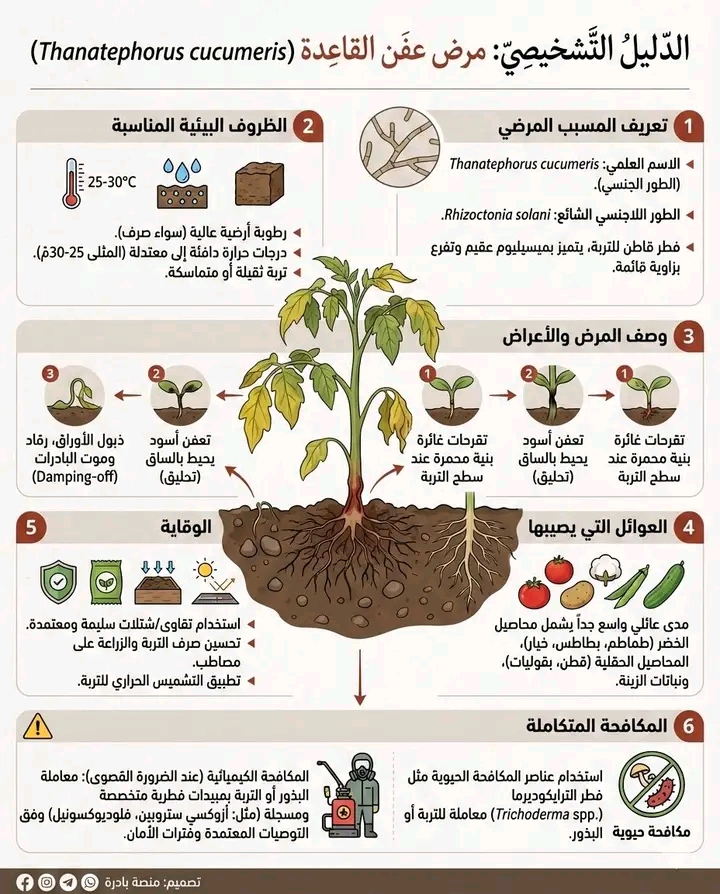 الدليل التشخيصي لمرض عفن القاعدة🎯 العنوان الرئيسي الدليل التشخيصي: مرض عفن القاعدة (Thanatephorus cucumeris)القاتل الصامت في حقول الخضراوات🦠 هوية الممرض: التعريف العلمي🔬 الاسم العلمي: Thanatephorus cucumeris (الشكل الجنسي)🔄 الاسم اللاجنسي: Rhizoctonia solani (الشكل الشائع)📊 التصنيف: فطر دعامي – Basidiomycota🧬 السمة المميزة: يشكل خيوطاً فطرية متفرعة بزوايا قائمة وزوايا انعطاف واضحة🌡️ الظروف البيئية المثلى للتفشي· درجة الحرارة: ٢٣-٢٨°م (نطاق حرج) 🌡️· الرطوبة الجوية: فوق ٨٥٪ لمدة متواصلة 💦· رطوبة التربة: عالية مع سوء الصرف 🚿· التهوية: ضعيفة في البيوت المحمية 🏡· حموضة التربة: متعادلة إلى حمضية قليلاً (بين ٥.٥ و ٧) ⚗️· الموسم: الربيع والخريف في الحقل المكشوف 🌦️📋 وصف المرض وآلية الإصابة· نوع الممرض: فطر ترابي متخصص في مهاجمة منطقة التاج والقاعدة 🌱⚔️· مصدر العدوى: الأجسام السكليروتية في التربة – تبقى حية من ثلاث إلى خمس سنوات 💎· طريقة الانتشار: الاتصال المباشر – المياه – الأدوات الملوثة – البذور المصابة 🔄· آلية الإصابة: يفرز إنزيمات محللة مثل البكتيناز والسللوز التي تحلل جدران الخلايا النباتية 🧪⚠️ الأعراض التشخيصية (حسب مرحلة النمو)مرحلة البادرة / الإنبات:· موت البادرات قبل الخروج من التربة (ظاهرة الاختناق) ☠️· تقرح بني محمر عند قاعدة الساق 🤎· ذبول مفاجئ مع بقاء الجذور سليمة نسبياً 🍃مرحلة النمو الخضري:· تقرحات غائرة بنية اللون عند قاعدة الساق 🔍· انسداد الحزم الوعائية مما يمنع انتقال الماء والعناصر ⬆️· اصفرار الأوراق السفلية وانتشاره للأعلى 🟡· ضعف عام وتقزم النبات 📏مرحلة الإصابة المتقدمة:· تعفن كامل لمنطقة التاج والجذور الرئيسية 🍂· وجود خيوط فطرية بنية على الأنسجة المصابة 🕸️· سهولة اقتلاع النبات من التربة 💔(مقارنة بصرياً بين نبات سليم وآخر مصاب مع تفاصيل الأعراض)🌾 مجموعة العوائل النباتية (النطاق الواسع)يشمل المرض أكثر من مئتي نوع نباتي! 📊محاصيل شديدة الحساسية:· البطاطس والطماطم والفلفل بأنواعه· الخيار والفاصوليا والفراولة· القطن وبنجر السكرمحاصيل متوسطة الحساسية:· الذرة والقمح والشعير· بعض أشجار الفاكهة الصغيرة مثل التفاح والكمثري 🛡️ إستراتيجيات الوقاية (الإدارة المتكاملة)أولاً: الممارسات الزراعية الوقائية:· تعقيم التربة: بالبخار أو المطهرات الكيميائية قبل الزراعة ♨️· الصرف الجيد: تجنب مناطق التجمعات المائية 🚜· التباعد الزراعي: مسافات مناسبة بين النباتات 📐· تعقيم الأدوات: بين خطوط الزراعة المختلفة 🧼· استخدام أصول مقاومة: أو مطعمة على أصول مقاومة 🌱🛡️ثانياً: الممارسات البيئية:· التهوية الجيدة: في البيوت المحمية 💨· الري بالتنقيط: بدلاً من الرش بالرشاشات 💧· التسميد المتوازن: تجنب زيادة النيتروجين ⚖️· الدورة الزراعية: مع محاصيل غير عائلة لمدة ثلاث إلى أربع سنوات 🔄⚔️ إستراتيجيات المكافحة (عند ظهور الإصابة)١. المكافحة الزراعية الفورية:· إزالة النباتات المصابة وحرقها خارج الحقل 🔥· تعريض منطقة الإصابة للشمس والهواء الجاف ☀️· وقف الري مؤقتاً حتى تجف التربة قليلاً ⏸️· إضافة مواد عضوية محسنة لبنية التربة 🍂٢. المكافحة الحيوية (البدائل الآمنة):· مبيدات حيوية: مثل الترايكوديرما هارزيانوم والباسيلس سبتلس 🛡️· المستخلصات النباتية: الثوم، النيم، القرفة 🌿· المحفزات الحيوية: لتعزيز مناعة النبات 💪٣. المكافحة الكيميائية (الملاذ الأخير):يجب الاستخدام وفق التوصيات والإرشادات المحلية فقطالمواد الكيميائية الفعالة:· فلو تولانيل: من مجموعة كاربوكساميد، يستخدم لمعاملة التربة، فعال ضد الأجسام السكليروتية· بينسي كورون: من مجموعة فينيل يوريا، يستخدم لرش منطقة التاج، خاص بمقاومة الريزوكتونيا· أزوكسي ستروبين: من مجموعة ستروبيلورين، يستخدم كرش وقائي، نظامي جزئي· بنتاكلورونيتروبنزين: من مجموعة نيتروأروماتيك، يستخدم لتعفير التربة في البيوت المحمي