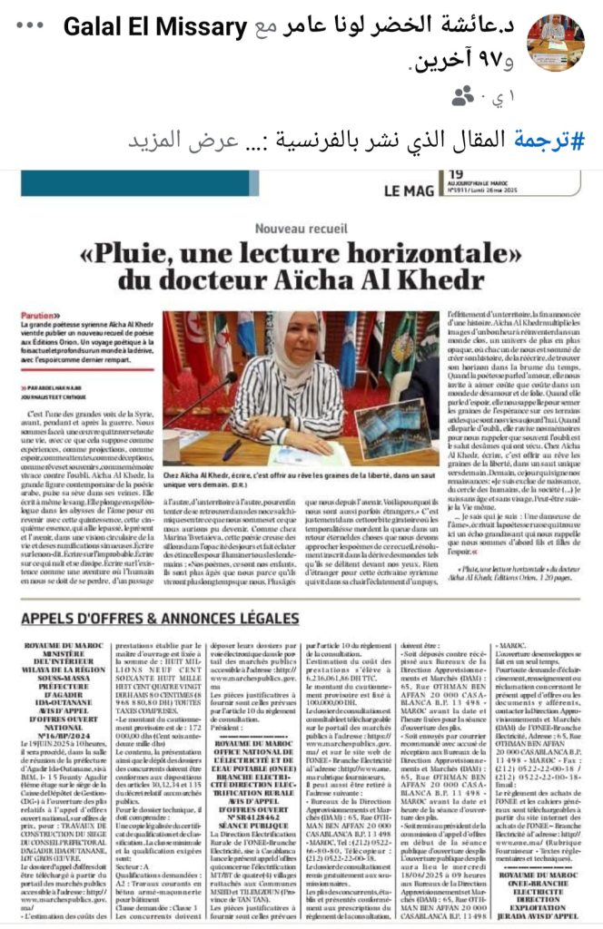 ديوان مطر لعائشة الخضر.بقلم عبد الحق نجيب ،ترجمة هناء ميكو