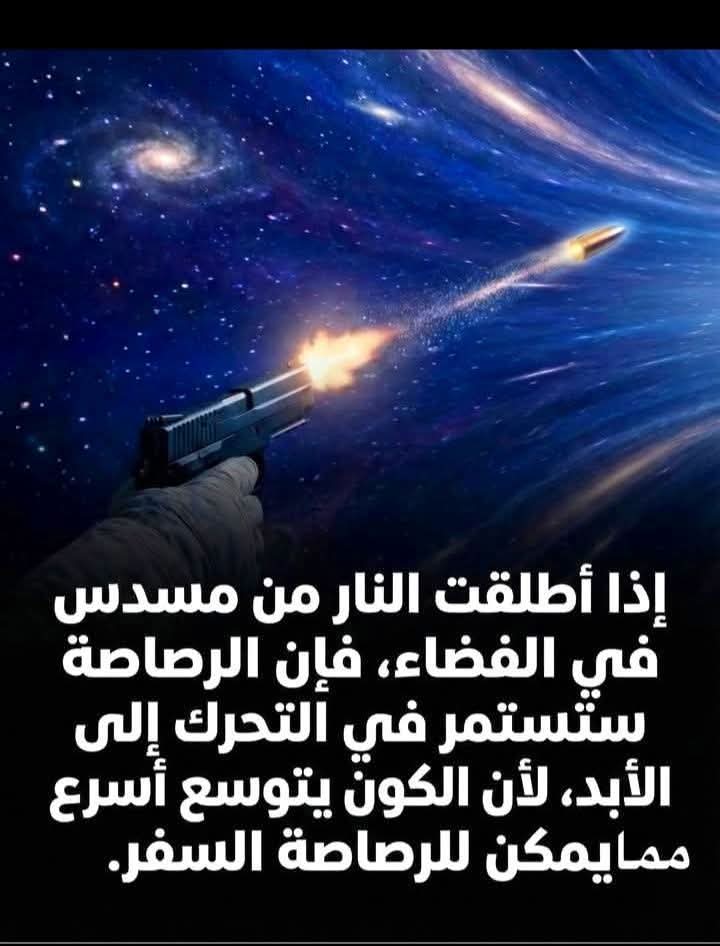 الرصاصة الأبدية: رحلة بلا نهاية في أعماق الكون تخيل للحظة أنك تطفو في الفراغ العظيم، حيث يسود الصمت المطلق ولا وجود للهواء. ترفع مسدساً نحو الظلام الدامس وتضغط على الزناد. في تلك اللحظة، أنت لا تطلق مجرد قطعة معدنية، بل تبدأ رحلة قد تستمر إلى نهاية الزمان.لماذا لا تتوقف الرصاصة؟على كوكب الأرض، الرصاصة محكوم عليها بالتوقف لسببين رئيسيين: مقاومة الهواء التي تبطئ سرعتها، والجاذبية التي تسحبها للأسفل لترتطم بالأرض. لكن في الفضاء، هذان العاملان غير موجودين. وفقاً لقانون نيوتن الأول للحركة: “الجسم المتحرك يبقى متحركاً بنفس السرعة وفي نفس الاتجاه ما لم تؤثر عليه قوة خارجية”.بمعنى آخر، الرصاصة التي تخرج من فوهة المسدس في الفضاء ستظل محتفظة بسرعتها الابتدائية للأبد، مبحرة في خط مستقيم عبر الفراغ السرمدي.سباق مع الكونما يجعل الفكرة أكثر إثارة، كما تذكر الصورة، هو توسع الكون. نحن نعيش في كون لا يتوقف عن التمدد، والمجرات تبتعد عن بعضها البعض بسرعات خيالية.حتى لو انطلقت الرصاصة بسرعة فائقة، فإن الفضاء نفسه “يخلق” مسافات جديدة أمامها باستمرار. الكون يتوسع بمعدل قد يتجاوز سرعة الرصاصة في الوصول إلى حافته (إذا كان له حافة). لذا، فإن الرصاصة لن تكون مجرد قطعة معدنية تائهة، بل ستكون في سباق أبدي، تطارد أفقاً يهرب منها باستمرار، محكومة بالسفر في عزلة تامة عبر مليارات السنين الضوئية، وربما تظل شاهدة على تاريخ الكون حتى بعد فناء الحضارات التي صنعتها.إنها ليست مجرد طلقة نار؛ إنها كبسولة زمنية تنطلق نحو اللانهاية. # الفيزياء والكون# مجلة ايليت فوتو ارت.