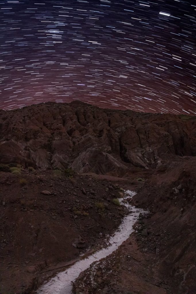 ثم انطلقنا بالسيارة إلى سان بيدرو دي أتاكاما، حيث قضينا أسبوعًا تقريبًا بين تشكيلات صخرية ورملية فريدة من نوعها. بعد ذلك، سافرت كيرا إلى بوليفيا بينما بقيتُ في سان بيدرو لأني أردت استكشاف أكثر صحاري العالم جفافًا، وهي من أكثر الصحاري غير القطبية جفافًا. استأجرتُ عربة تخييم وقضيتُ خمس ليالٍ أخرى تحت سماءٍ تُعدّ من أجمل سماء العالم لمراقبة النجوم وتصويرها.