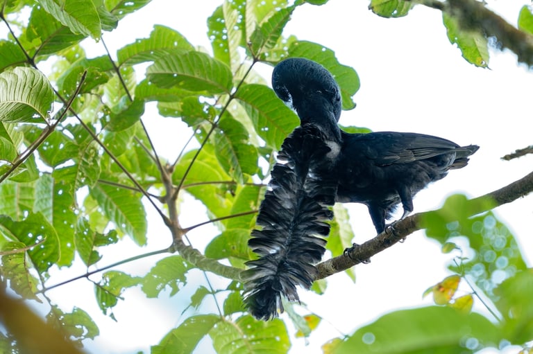 لم يمضِ وقت طويل حتى لمحنا صاحب ذلك الصوت، جاثماً على إحدى الأشجار على حافة مرعى. كانت هذه الشجرة جزءاً من غابة كثيفة، أما الآن فهي تقف وحيدة، لا تزال مغطاة بسجادة سميكة من الطحالب الهوائية والبروميليات والأوركيد. تقع هذه الشجرة تحديداً على أطراف ساحة تزاوج تستخدمها طيور المظلة منذ عقود، وربما لفترة أطول. أما الساحة الرئيسية، حيث تدور المنافسة الحقيقية على الإناث، فتقع أعلى المنحدر قليلاً، بجوار إحدى رقع الغابة المتبقية.