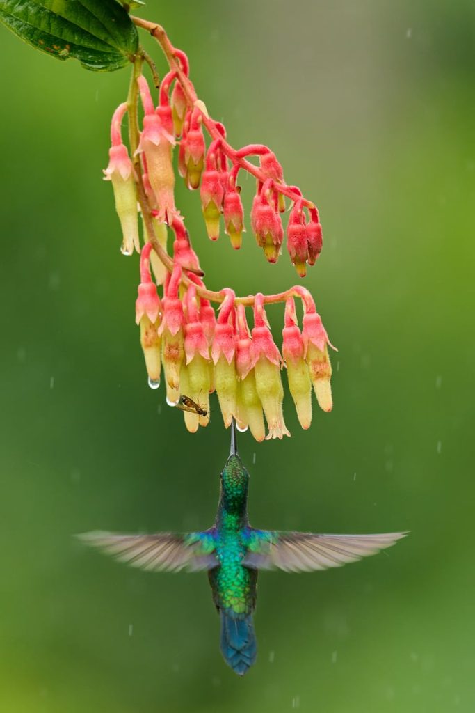 عند تصوير الطيور الطنانة، تُعتبر سرعة الغالق 1/500 من الثانية طويلة نسبيًا. من المؤكد أن السرعات التي تقارب 1/2000 من الثانية ستُنتج أجنحة أكثر وضوحًا. مع ذلك، في هذه الحالة، كان من المرغوب فيه وجود بعض التشويش في كلٍ من الأجنحة وقطرات المطر المتساقطة. طائر الطنان ذو الأذن البنفسجية المتلألئة (Colibri coruscans)، الإكوادور.