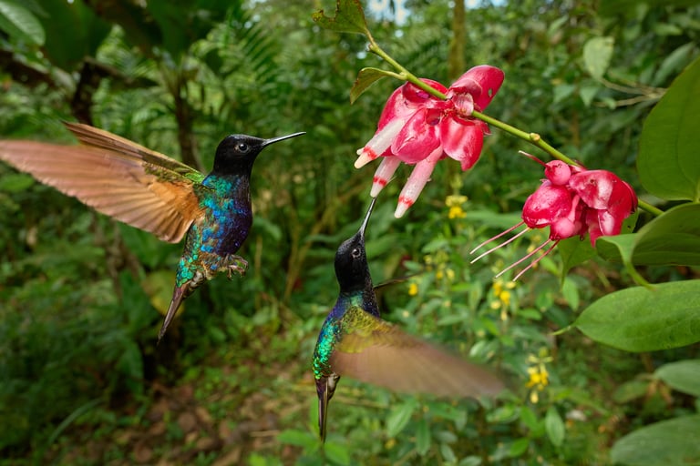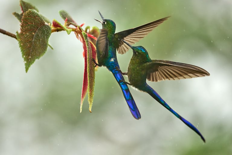 في المعارك الجوية بين الطيور الطنانة، لا تُعدّ سرعة 1/1250 ثانية كافية عادةً. مع ذلك، تعرّض هذا الذكر من طائر الطنان ذي الذيل البنفسجي (Aglaiocercus coelestis) للهجوم في لحظة سكون نسبية أثناء التغذية، مما أسفر عن صورة واضحة إلى حدٍّ معقول.