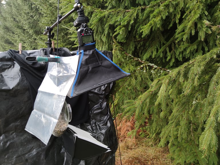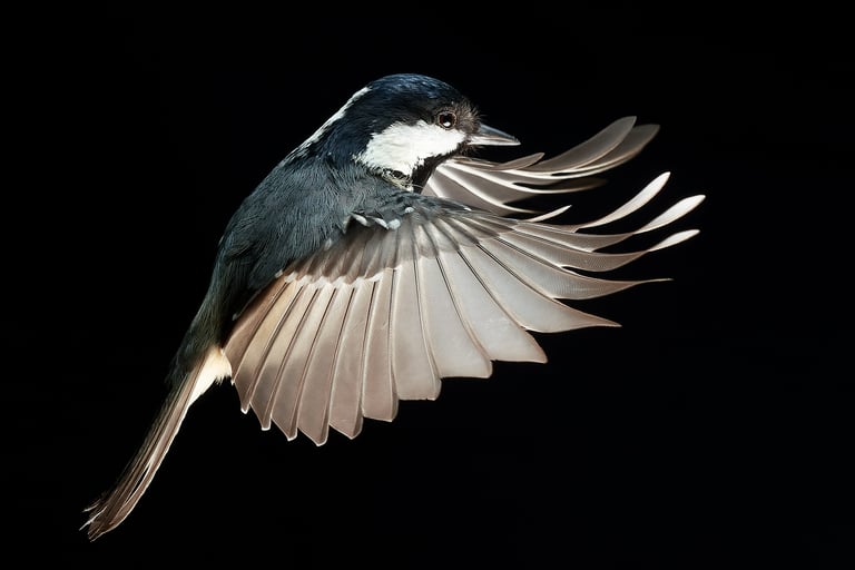 أدى استخدام فلاشين من نوع نيكون بمدة وميض قصيرة للغاية وفتحة عدسة ضيقة إلى الحصول على صورة فائقة الوضوح لهذا الطائر من نوع القرقف الفحمي (Periparus ater). ولإثبات أن الصورة التُقطت في الطبيعة، كان بإمكاني استخدام فلاش إضافي لإضاءة الخلفية.