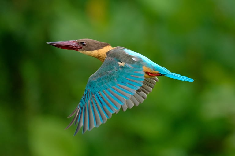 كانت هذه الصورة لرفراف ذي منقار اللقلق (Pelargopsis capensis) نتاج حظ محض وكاميرا جاهزة لالتقاط هذا الحظ. عندما طار الرفراف المذعور فجأة، لم يتطلب الأمر سوى توجيه الكاميرا، وضبط التركيز، والضغط على زر الغالق.