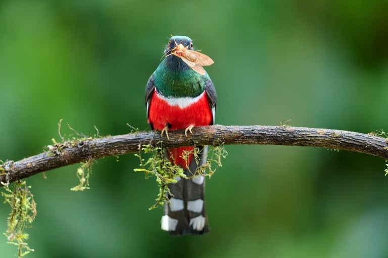 مع قليل من الحظ، حتى مع سرعة غالق تبلغ 1/40 ثانية، يمكنك التقاط ثلاثة مخلوقات بوضوح في إطار واحد – طائر التروغون المقنع (Trogon personatus)، وفريسته (التي يحملها في منقاره)، وطفيلياته (قرادة تحت عينه اليمنى).