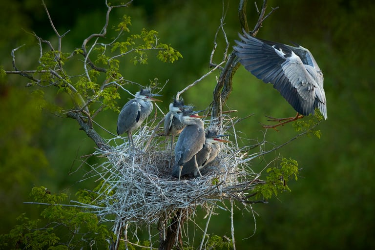 طائر مالك الحزين الرمادي (Ardea cinerea) عائد إلى عشه محملاً بالأسماك لصغاره الجائعة باستمرار. بالنسبة لطيور مالك الحزين بطيئة الطيران نسبياً، عادةً ما تكون سرعة 1/1000 من الثانية كافية للحصول على صور واضحة.