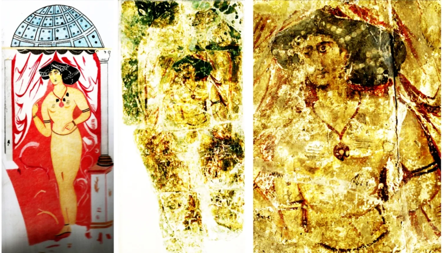 تحني هذه المرأة رأسها انحناءة طفيفة، وتبدو ملامح وجهها جليّة. العينان لوزيتان، يعلوهما حاجبان عريضان منفصلان. الأنف طويل، ومنخراه محدّدان بدقة. الثغر محدّد بشكل مماثل، مع شق في الوسط يفصل بين شفتيه. الذقن عريض، وكذلك العنق. الصدر ممتلئ، ويعلوه عقد من الحجارة الدائرية المنمنمة الحمراء، تتدلّى منه في الوسط قلادة عريضة تزيّنها ثلاثة فصوص بيضاء. تماثل هذا العقد من حيث الشكل عقود الياقوت الأحمر، ويشكّل جزءاً من الحلي التي تتزّين بها هذه المرأة. يعلو الرأس شعر أسود كثيف، يكلّله بكتلة بيضاوية سوداء. وتعلو هذه الكتلة شبكة مكوّنة من سلاسل من الحجارة اللؤلؤية البيضاء. ترفع المرأة بيدها اليمنى طرف الستارة، وتشير بيدها اليسرى إلى الأسفل. يُزيّن كلّاً من هاتين اليدين سوار خطّ باللون الأسود، كما يزّين كلاً من الذراعين سوار مزدوج خطّ بأسلوب مماثل، وتظهر عند أعلى الحوض سلسلة مشابهة تنعقد حول الوسط على شكل حزام رفيع. الساقان مكتنزتان وملتصقتان، وتكشف القدم اليمنى عن سوار إضافي يأخذ هنا شكل خلخال بسيط.