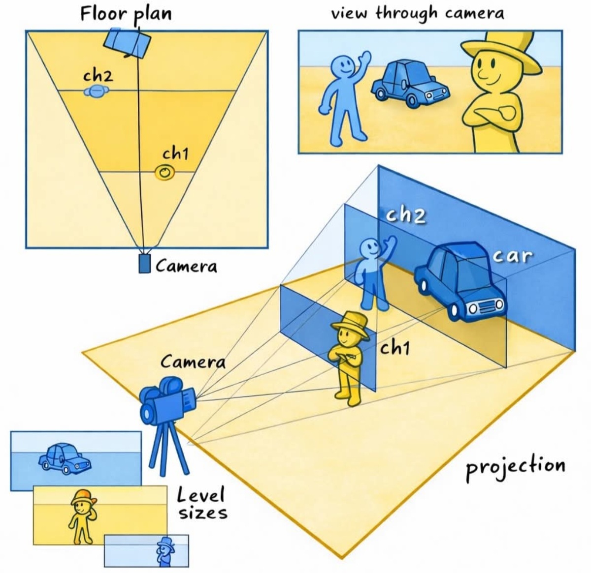 إلا أن الكاميرا تُعيد توحيدهم أو تفريقهم بصريًا حسب موقعهم في العمق.
