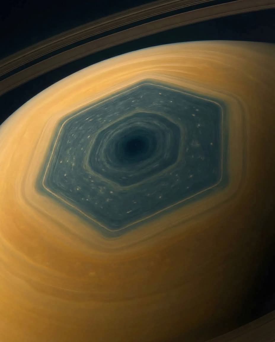 سداسيٌّ مثاليّ يبلغ عرضه نحو 30,000 كيلومتر على القطب الشمالي لكوكب زحل.🪐 يدور عكس اتجاه عقارب الساعة، ويتمّ دورة كاملة كل 10 ساعات و40 دقيقة… وهو موجود هناك منذ أكثر من 40 عامًا.# الفيزياء والكون# مجلة ايليت فوتو ارت.
