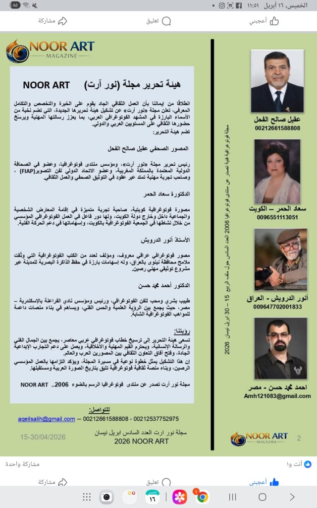 شكرًا لكل من ترك بصمته في هذا العدد، ووقّع حضوره بالضوء والظل، فصارت الصورة أكثر حياة، والحكاية أكثر دفئاً،ولن تنتهي رحلتنا هنا بل ندعوكم، أنتم وكل من تعرفون من الزملاء والمهتمين، إلى مرافقتنا في رحلات قادمة، لنرسم معاً أسمى حكايات الإنسان والطبيعة بعدسةٍ لا تكفّ عن الحلم والإبداع.