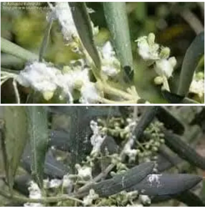 #حشرة_الزيتون_القطنيه:مكافحة حشرة الزيتون القطنية تظهر خلال شهر اذار و نيسان حشرة الزيتون القطنية المعروفة بالعسيلة (البسيلا Olive psyllid) Euphyllura olivina costa في شكل كتل تشبه القطن تحتمي بداخلها الافة على ازهار الزيتون ويكون ضررها على الاشجار في تقليل نسبة عقد الازهار.#وصف_الحشرة:طول الحشرة البالغة حوالي 0.25 سم. لونها بني مخضر ولها أجنحة. والحورية واليرقة تشبه الحشرة مع عدم وجود أجنحة. تبيت الحشرة الكاملة في الشتاء في قواعد أنصال وبراعم الأوراق، وفي الربيع وبالذات في شهر نيسان عند بدء ارتفاع درجة الحرارة تنشط الحشرة. تضع الأنثى البيض على الأغصان القريبة من الأزهار وتضع البيض خلال شهري نيسان و ايار.#الضرر:تتغذى الحشرة على الأزهار، وتفرز كمية كبيرة من الشمع الأبيض (على شكل كتل قطنية بيضاء لزجة) يغطي النورات الزهرية والبراعم الخضرية، كما تفرز مادة عسلية ينمو عليها فطر العفن الأسود، وتؤدي الإصابة إلى جفاف الأزهار وتساقطها، إعاقة عملية التلقيح وبالتالي انخفاض في المحصول، ذبول وسقوط الأوراق وانخفاض كفاءة التمثيل الضوئي نتيجة تغطية الكتل القطنية للأوراق. يمكن أن تهاجم الثمار وتؤدي إلي تساقطها. #المكافحة:تكافح الحشرة بالاهتمام بعمليات الخدمة من ري وتسميد وتنظيف الأرض من الحشائش والتقليم مع حرق الأفرع المصابة. الرش بالزيوت المعدنية الصيفية خلال بداية الربيع بمعدل 1.5% منفردا أو يضاف إليه أحد مبيدات الحشرات.وفى حالة ظهور الإصابة خلال فترة الإزهار ترش الأشجار بأحد المبيدات التالية: بالملاثيون بتركيز 3 في الألف الأنثيو بتركيز 2 في الألف. روجر 40 بمعدل (1.5-1سم3/ للتر). ديزكتول بمعدل (3 سم3/ للتر). فيرتميك (0.5 سم3 /للتر). دروسبان (2-1.5 سم3/ للتر). مكافحة حشرة الزيتون القطنية. # المهندس عماد الدين شلهوب# مجلة ايايت فوتو ارت..