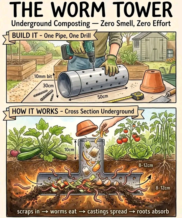 🌱 برج الديدان: نظام ذكي لتسميد التربة داخل حوض الزراعةهل يمكن تحويل بقايا المطبخ إلى سماد غني مباشرة داخل التربة دون صندوق سماد، دون تقليب، وبدون روائح؟ نعم، باستخدام برج الديدان (Worm Tower). الفكرة بسيطة: أنبوب مدفون في حوض الزراعة تُوضع فيه بقايا الطعام، فتدخل الديدان عبر الثقوب، تتغذى عليها، ثم تنشر فضلاتها الغنية بالمغذيات في التربة المحيطة، لتصل مباشرة إلى جذور النباتات.🪵 الأدوات المطلوبة:• أنبوب تصريف مياه بقطر حوالي 30 سم وطول 50 سم• مثقاب مع رأس حفر 10 مم• غطاء أو أصيص مقلوب لمنع دخول المطر• حوض زراعة أو سرير مرتفع للزراعة🌿 طريقة الإنشاء:• قم بحفر ثقوب كل 5 سم في الثلثين السفليين من الأنبوب• احفر حفرة في وسط حوض الزراعة بعمق يسمح بدفن الأنبوب مع بقاء 10 سم فوق سطح التربة• أعد التربة حول الأنبوب وثبّتها برفق• أضف قبضة من السماد العضوي وبعض الديدان من التربة لبدء النظام• ضع الغطاء في الأعلى🐛 طريقة الاستخدام:• أضف أسبوعياً كميات صغيرة من بقايا المطبخ مثل قشور الخضار، بقايا الفواكه، أكياس الشاي، وقشور البيض المطحونة• تدخل الديدان عبر الثقوب، تتغذى على البقايا، ثم تعيد فضلاتها الغنية بالمغذيات إلى التربة• تحصل النباتات على تغذية طبيعية مستمرة وبطيئة• لا يحتاج النظام إلى تقليب، ولا يسبب روائح، ولا يجذب الذباب إذا بقي الغطاء مغلقاً📌 معلومة مهمة: برج ديدان واحد يمكنه تغذية مساحة بقطر يقارب مترين من حوض الزراعة، بينما الحوض الكبير قد يحتاج برجين. بهذه الطريقة تتحول بقايا الطعام المنزلية إلى سماد طبيعي يغذي النباتات مباشرة داخل التربة.#الزراعة_العضوية #برج_الديدان #سماد_طبيعي #الزراعة_المنزلية #Vermicompost 🌿# مجلة ايليت فوتو ارت.