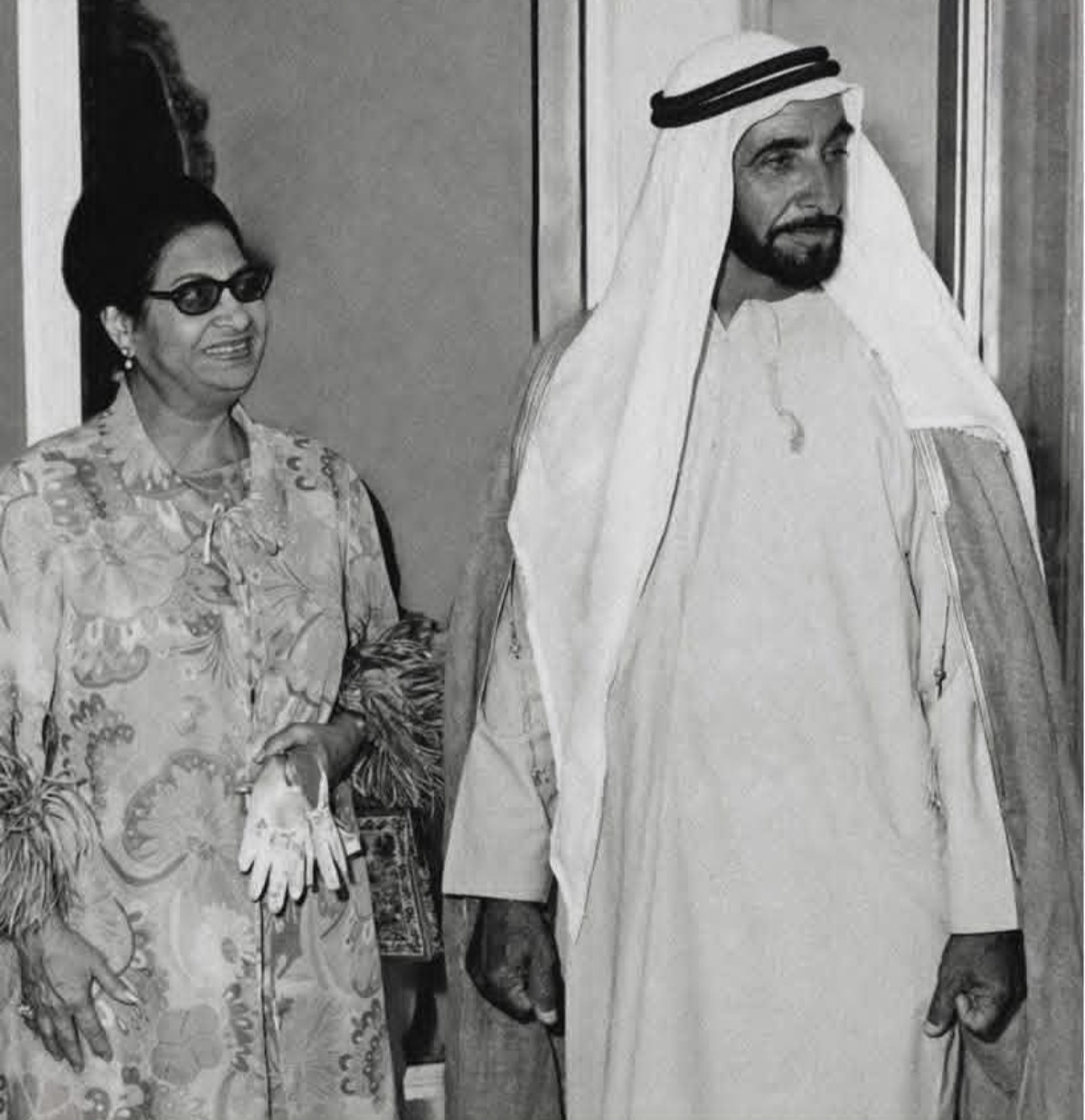 أم كلثوم ارتدت ثوبا غامقا، وتحلت بعقد من اللؤلؤ الخليجى أهداه لها الشيخ زايد، وكان الحفل لدعم المجهود الحربى المصرى، وحضرته جموع غفيرة، وبقيت بعده فى ضيافة القيادة فى أبو ظبى لتشهد ميلاد الدولة.. تذكر «الاتحاد»: «بعد إعلان قيام دولة الإمارات العربية، توجه صاحب السمو الشيخ خليفة بن زايد ولى العهد إلى ساحة قصر المنهل العامر، وأمر برفع العلم، ورفع سموه يده بالتحية لعلم الاتحاد الذى يرفرف على البلاد لأول مرة، وشهدت سيدة الغناء العربى أم كلثوم مراسم رفع العلم، وقدمت التهنئة إلى سمو الشيخ خليفة، وقالت له: «عقبال علم الوحدة العربية الكبرى».