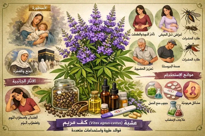 نبات عشبة كف مريم الاسطوري للنساءشجرة كف مريم اسم علمي: Vitex agnus-castus لها العديد من الإستخدامات الطبية عبر التاريخ الطبي القديم والحديثولها أسماء كحشيشة أبو شبح و حب الفقد و عشبة الرهبان وعشبة العفه و شجرة ابراهيم و مدعي الحمام و شجرة فلفل الراهب و غيرها و لكن كف مريم هو أشهرهم ويعتقد أن التسمية جاءت من أسطورة تدعي أن مريم عليها السلام كانت تقبض بيدها عليها أثناء ولادتها ونظراً لما لنبات كف مريم من مكانة شبه اسطوريه لدى سكان اغلب البلدان الآسيوية ومن أهمية طبية في حياتهم فإن الحجاج القادمين من ايران مثلا وافغانستان وباكستان واندونسيا وغيرها يحملون معهم هذا النبات لبيعه ايام الحج والعمره ولذلك تراه في مكة المكرمة منتشرا بكثرةفوائد عشبة كف مريم :1- نبات كف مريم هو نبات طبيعي غني بالفوائد يساعد في القضاء على الميكروبات و يسهل ويعجل الولادة ويعالج متلازمة قبل الحيض pms حيث يتم تناول عشبة مريم شربا عن طريق الفم . فتقلل أعراض متلازمة ما قبل الحيض للحد من آلام الثدي و التهيج و الإكتئاب و سوء المزاج و تقلبات الغضب و الصداع و للحد من إنتفاخات البطن .2- تستخدم العشبة أيضًا في حالات عدم إنتظام الدورة الشهرية و متلازمة و أعراض ما قبل الحيض منها الطمث الإكتئابي pmdd و علاج عقد الثدي و (الداء الكيسي الليفي ) إضطرابات ما قبل الطمث الإكتئابية.3- نستخدم العشبة لعلاج تاخر الانجاب عند النساء وكذلك علاج الإجهاض الناتج عن انخفاض هرمون البروجسترون و التخلص من النزيف و تساعد الجسم للتخلص من المشيمة بعد الولادة و العمل على زيادة حليب الثدي .حيث يتم تناول العشبة عن طريق الفم شربا و قد يستغرق الامر ما بين ثلاثة أشهر إلى سبعة إشهر لاجل تحقيق الحمل وفق مايشاع .4- هى مفيده لتدفق البول و علاج تضخم البروستاتا الحميد و لكنها تضعف الرغبة الجنسية تماما لذلك نجد ان احد اسمائها في قائمة الاعشاب عشبة الرهبان5- تستخدم العشبة أيضًا لطرد الطفليات و منع لدغ الحشرات فتقضي على البراغيث بشكل فعال و البعوض كذلك الذباب عندما يتم وضعها على الجلد لذلك يكثر استخدمها في الاماكن الريفية في مختلف مدن العالم الممتلئة بالحشرات الطائرة6- تساعد ايضا في علاج حب الشباب و العصبية والتوتر وحالات الخرف و مشاكل المفاصل و نزلات البرد و كذلك إضطربات المعدة و الطحال و ألام العين و إلتهابات الجسد و التورمأضرار عشبة مريملكل شيء حدين سلبي و ايجابي :1- من الإثار الجانبية للعشبة اضطربات المعدة و الغثيان و الحكة و بعض الطفح الجلدي و بعض اضطربات النوم و زيادة الوزن ..كما يوجد بعض التدخلات الدوائية للعشبة ولذا لا يفضل أخذ العشبة أثناء الحمل و الرضاعة لكي لا يحدث تداخل هرموني كالتهاب بطانة الرحم و الأورام الليفية الرحمية و سرطان الثدي2- يمكن أن تتداخل العشبة مع التلقيح الاصطناعي وقد تفسد فعالية الإخصاب بالمختبر لذلك ننصح بعدم استخدام العشبة مع مثل هذه الحالات3- في حالة أخذها علاج لمرض الباركنسون يجب استشارة الطبيب منعًا للتداخل الدوائي . كذلك تتداخل مع الأدوية الكيميائيه العصبية التي تصرف لمرض الفصام والإضطربات النفسية لأن لها تأثير على مادة كيميائية بالدماغ هي الدوبامين4- تتداخل العشبة مع استعمال حبوب منع الحمل و تقلل من تأثيرها و تتداخل مع الاستروجينات و تقلل من تأثيرها-اجريت حول ثمار النبات الكثير من الأبحاث العلمية المبكرة بدأت على يد الدكتور الالماني جيرهارد ماديس Gerhard Madaus – الباحث فى النباتات، وذلك فى عام 1930م. حيث باستخلاص المواد الفعالة فى الثمار الجافة من نبات كف مريم، والتى لها أثر قوى فى إطلاق هرمون البروجسترون من معاقله فى الجسم، بعد تنبيه الغدة النخامية بأن تأمر المبايض بإنتاج القليل من هرمون الاستروجين عندما يوجد فى الدم الكثير منه، وبذلك تعيد التوازن إلى ميزان الهرمونات الأنثوية فى الجسمكما اعدت بشان النبات وثماره عديد اطروحات الدكتواره في كثير من دول العالم . بما في ذلك الدول العربيهينتج منه الان علاجات ومنتجات مختلفه 
