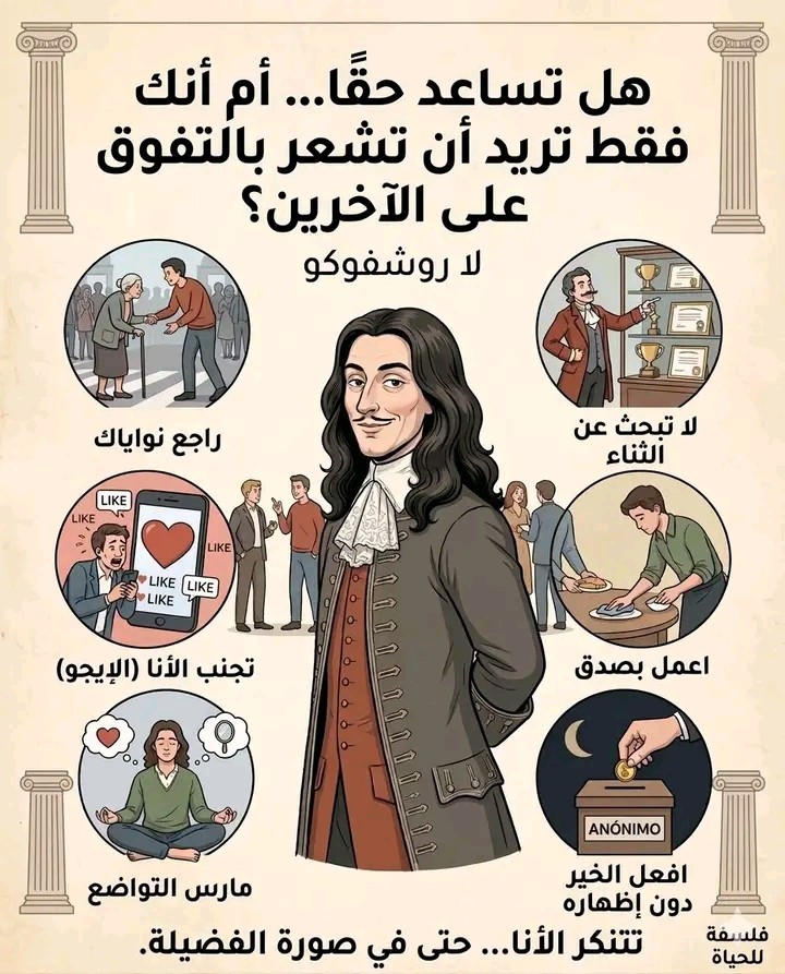 يُعدّ فرانسوا دو لا روشوفوكو أحد أبرز مفكري الأخلاق في القرن السابع عشر، حيث تميّز بتحليله الحادّ والمباشر للطبيعة الإنسانية، بعيدًا عن النزعات المثالية التي تُضفي على السلوك البشري طابعًا من النقاء المطلق. فقد انطلق في تأملاته من فرضية مفادها أن الإنسان، في كثير من الأحيان، ليس كائنًا أخلاقيًا خالصًا بقدر ما هو كائن تحكمه دوافع خفية تتوارى خلف مظاهر الفضيلة. ومن خلال مجموعته الشهيرة من “الحِكَم”، سعى إلى تفكيك هذه الواجهة الأخلاقية، كاشفًا عن البنية العميقة التي تحرّك الأفعال الإنسانية.في هذا السياق، يبرز مفهوم “حب الذات” بوصفه محورًا مركزيًا في فلسفة لا روشوفوكو، حيث يرى أن العديد من الأفعال التي تُصنَّف ضمن دائرة الخير—كالعطاء، والمساعدة، والتضامن—لا تنفصل عن رغبة ضمنية في تحقيق الاعتراف الاجتماعي أو الشعور بالتفوق المعنوي. وبذلك، فإن الفضيلة لا تُنفى تمامًا، لكنها تُعاد قراءتها باعتبارها مشروطة ببواعث نفسية معقّدة، تتداخل فيها الأنانية مع الإيثار. إن هذا الطرح لا يسعى إلى تقويض الأخلاق، بل إلى إعادة مساءلتها من الداخل، عبر كشف التوتر القائم بين ما نظهره وما نُخفيه.غير أن دعوة لا روشوفوكو لا تتخذ طابعًا تشاؤميًا صرفًا، بل تنفتح على أفق تأملي نقدي يدعو الإنسان إلى ممارسة نوع من المراجعة الذاتية العميقة. فبدل الاكتفاء بالامتثال للصور الاجتماعية للفضيلة، يحثّ على تفكيك النوايا الكامنة وراء الأفعال، ليس بهدف الإدانة أو التقليل من قيمة السلوك الأخلاقي، بل من أجل بلوغ درجة أعلى من الوعي بالذات. إن هذا الوعي، في نظره، يشكّل شرطًا لإمكانية الفعل الأصيل، الذي يتحرّر—نسبيًا—من الحاجة إلى الإعجاب أو الاعتراف.ومع ذلك، يظلّ “الأنا” حاضرًا بوصفه بنية يصعب تجاوزها كليًا، إذ لا يختفي بقدر ما يعيد تشكيل نفسه في صور أكثر خفاءً وتعقيدًا. وهنا تكمن مفارقة المشروع الأخلاقي عند لا روشوفوكو: فكلما ازداد وعي الإنسان بذاته، ازدادت قدرة الأنا على التكيّف والتخفّي. لكن هذا لا يُبطل قيمة السعي نحو الأصالة، بل يجعله مسارًا مستمرًا من اليقظة النقدية، حيث يصبح الفعل الأخلاقي الحقيقي ممكنًا فقط في ظل وعي دائم بحدود الذات ومراوغتها.# كهف الفلسفة # مجلة ايليت فوتو ارت..