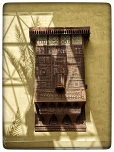 . المشربية هي نافذة خشبية بارزة، مزخرفة بأشكال هندسية دقيقة.