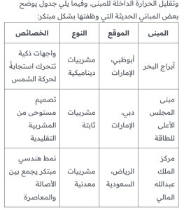 وتقليل الحرارة الداخلة للمبنى. وفيما يلي جدول يوضحبعض المباني الحديثة التي وظفتها بشكل مبتكر: