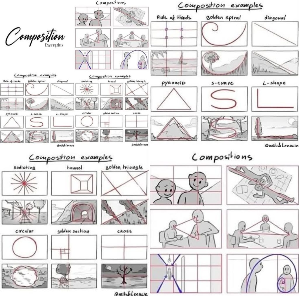 • لو عندك مشية بطل باتجاه نقطة مهمة، رتّب العناصر (طريق، بنايات، إضاءة) بحيث ينتهي اللولب عند شخصية البطل.