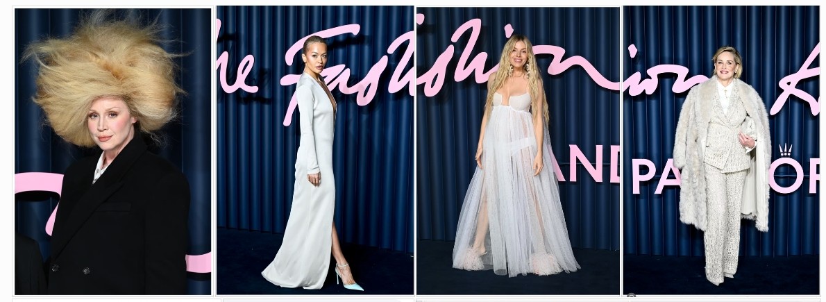 حضرت الممثلة الأمريكية شارون ستون ببدلة باللون الأبيض مؤلفة من جاكيت كلاسيكية وسروال بقماش شتوي مخرّم، وارتدت فوقه معطف من الفرو الضخم من دار الأزياء الإيطالية “برونيلو كوتشينيلي”.