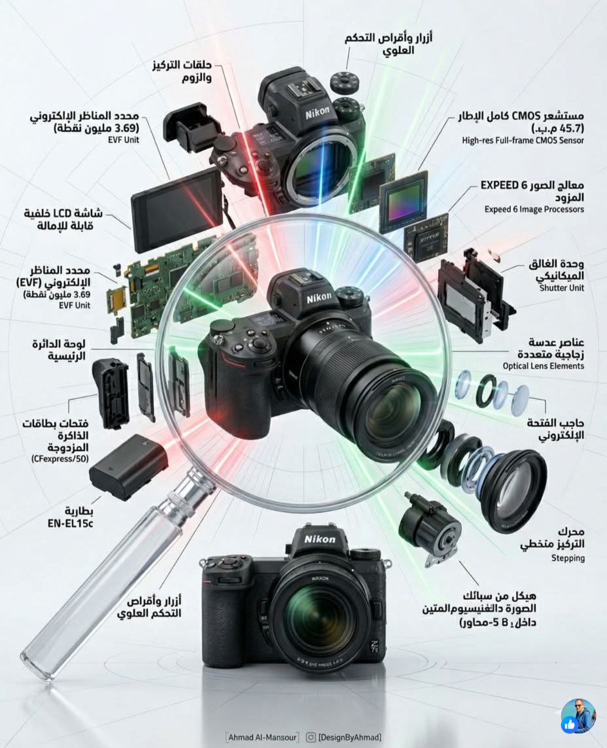 أنشئ إنفوجرافيك واقعي فوتوغرافي ثلاثي الأبعاد عالي الدقة يوضح التفكيك والتشريح الداخلي لِـ [اكتب اسم الآلة هنا] بمقاس 1080×1350 بنسبة 4:5 المخصص لمنشورات إنستجرام. اعتمد على المواصفات الحقيقية والأجزاء الداخلية الدقيقة من مراجع تقنية أو علمية موثوقة. في مركز التصميم يظهر نموذج مصغّر واقعي للآلة بحالتها السليمة، مع عدسة مكبرة شفافة تبرز المكونات الأساسية. تُعرض الأجزاء الداخلية بأسلوب Exploded View متفجّر شعاعيًا، متصلة بخطوط ضوء متوهجة توضّح مسارات العمل (طاقة / بيانات / حركة) بألوان مختلفة. الخلفية فاتحة مع شبكة هندسية دقيقة، إضاءة استوديو ناعمة واقعية، خامات حقيقية عالية التفاصيل، اتجاه القراءة من اليمين إلى اليسار، تسميات عربية واضحة لكل جزء مع مواصفاته المختصرة. في أسفل التصميم يظهر توقيع خفيف: [اكتب اسمك هنا] مع أيقونة إنستجرام صغيرة وشفافة. تجنّب الأسلوب الكرتوني أو التبسيط المخل.