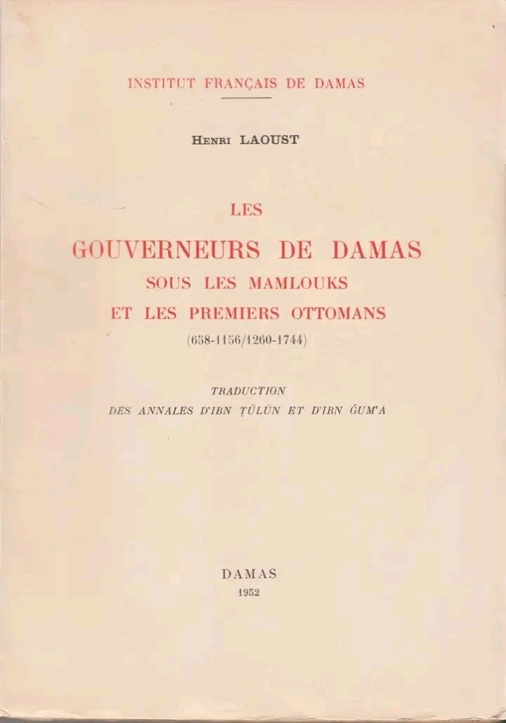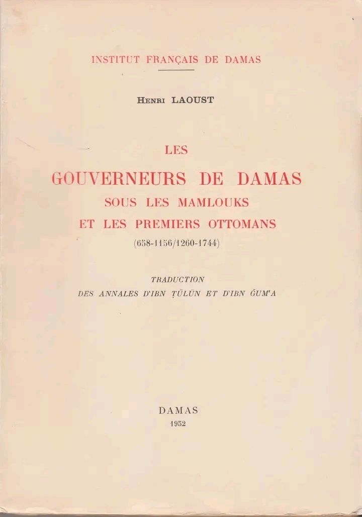 (٣). الناشر **[معهد دمشق الفرنسي]()** وسنة النشر ١٩٥٢.حقّقَ Laoust مخطوطة ابن طولون وترجَمَها قبل أن تصبح في متناولِ القرّاءِ العرب بفضل [محمّد أحمد دهمان]()** **عام ١٩٦٤؛ الأسبقيّة إذاً للفرنسييّن وإن كان تحقيق دهمان أغنى بالحواشي والشروحات القيّمة. عَرَّفَ Laoust قرّائَهُ بمحمّد **[ابن طولون](