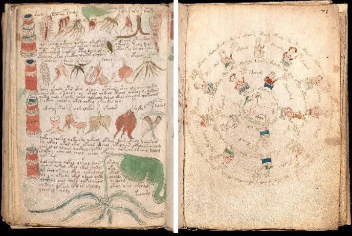 ما يجعل هذا الكتاب أكثر غموضًا ليس قِدمه فقط، بل محتواه العجيب. صفحات مليئة برسومات نباتات لا وجود لها في عالمنا، وأشكال فلكية وكواكب غير معروفة، وأجساد نساءٍ عاريات ينفّذن طقوسًا غامضة في أحواض من السائل الأخضر. هناك صفحات أخرى تُظهر أجهزة أو آليات لا يعرف أحدٌ وظيفتها.