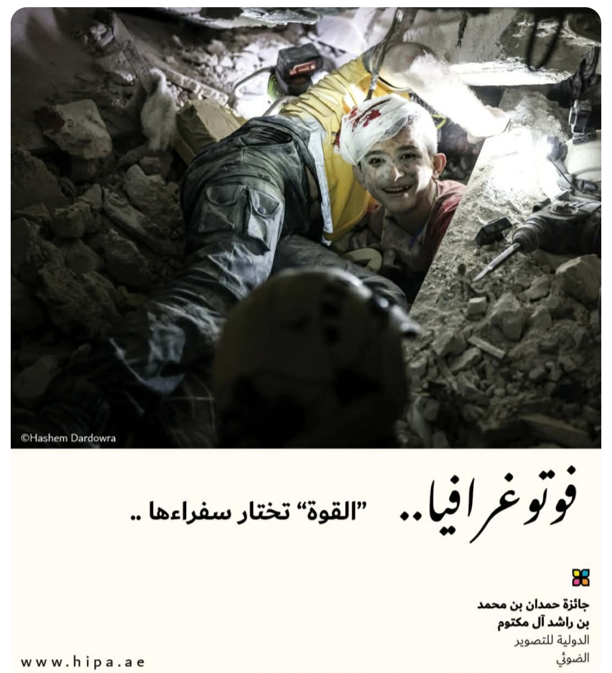 سموّ الشيخ / منصور بن محمد بن راشد آل مكتوم، رئيس اللجنة الأولمبية الوطنية، قام بتكريم الفائزين بهذا المحور، حيث كان المركز الأول من نصيب المصور السوري “هاشم دردوره”، بعملٍ فوتوغرافيّ آسر بعنوان “الفينيق يراوغ الموت”. بطل الصورة هو “خالد” الذي يخرجُ نافضاً الغبار من تحت أنقاضِ غارةٍ جوّيةٍ مدمِّرة في “إدلب” السورية، بعد إنقاذه من من قبل فرقُ الدفاعِ المدنيّ السوريّ المعروفة باسم “الخوذُ البيضاء” مُستخدمةً المثاقبَ الكهربائية والروافع اليدوية والمجسّات الصوتية، لتحديد مكانه بدقةٍ وسط الأنقاض المتداعية.