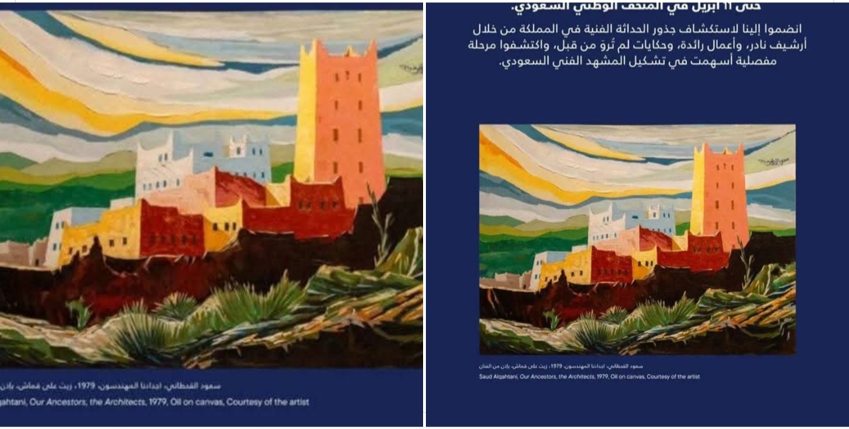 تحتاج هذه اللوحة لوصف بليغ ينصفها كتحفة فنية للفنان الرائد سعود القحطاني ، بعنوان (أجدادنا المهندسون) حيث تعانق الأرض كبرياء السماء.
