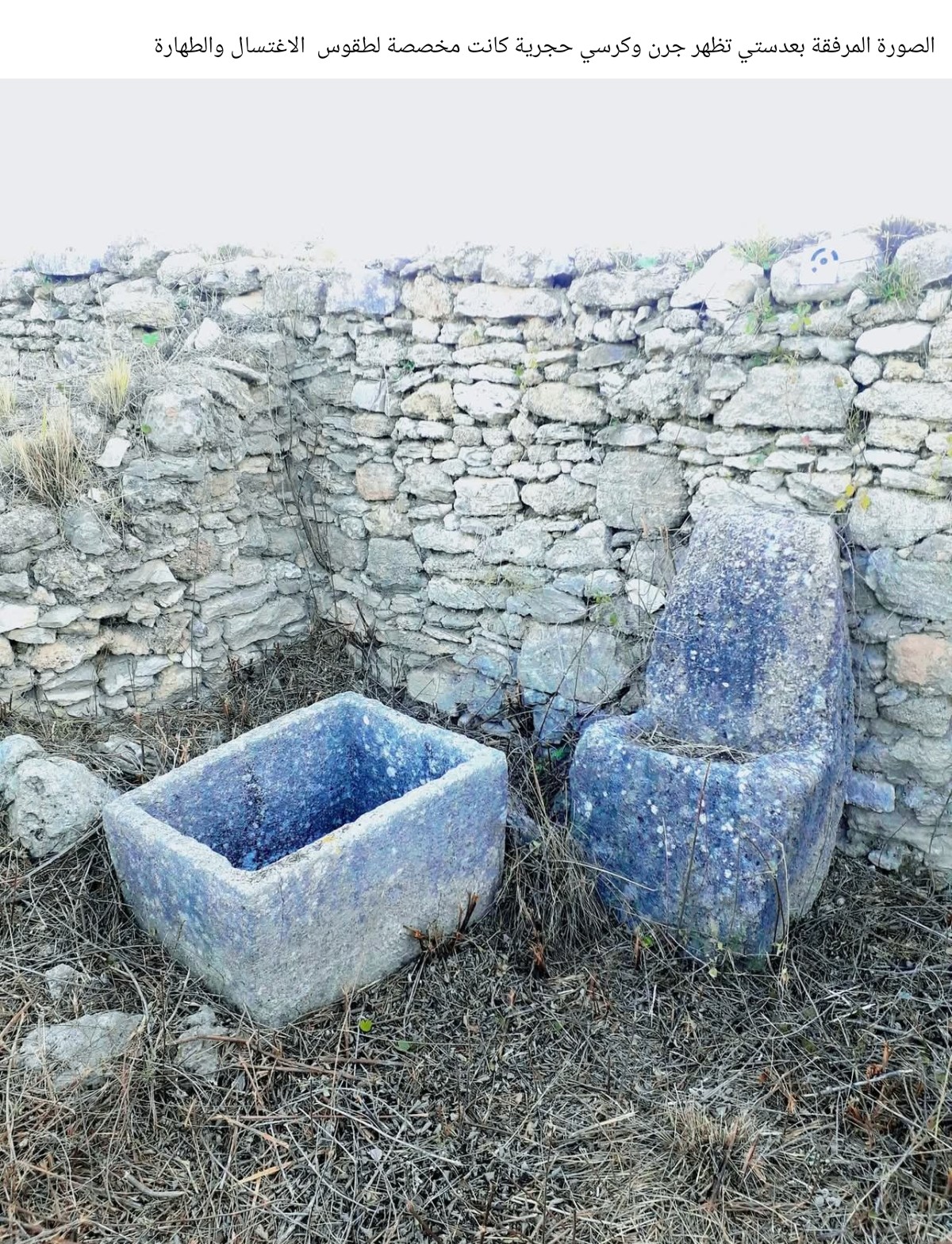 الصورة المرفقة بعدستي تظهر جرن وكرسي حجرية كانت مخصصة لطقوس الاغتسال والطهارة