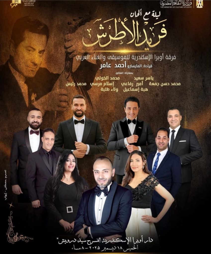 تنظّم دار الأوبرا المصريّة، برئاسة الدّكتور علاء عبد السّلام، مساء يوم الخميس 18 ديسمبر/كانون الأوّل القادم، حفلاً فنّيّاً لفرقة أوبرا الإسكندريّة للموسيقى والغناء العربيّ، بقيادة المايسترو أحمد عامر، وذلك على مسرح سيّد درويش بالمدينة..