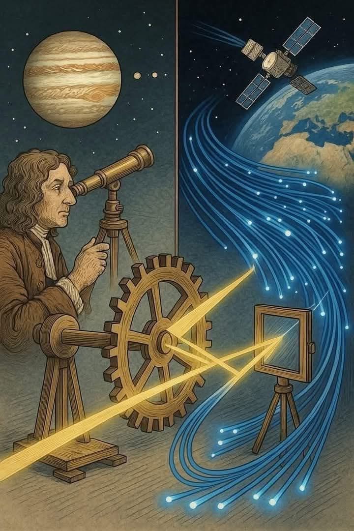 في أواخر القرن السابع عشر، وتحديدًا عام 1676، كان الفلكي الدانماركي أولريش رومر يراقب خسوف أقمار المشتري، ولاحظ أن توقيت هذه الخسوفات يختلف تبعًا لموضع الأرض في مدارها حول الشمس. من خلال هذا الاختلاف أدرك أن الضوء لا ينتقل لحظة وصول، بل يحتاج إلى زمن ليقطع المسافة بين الأرض والمشتري، وهكذا وضع أول تقدير لسرعة الضوء.