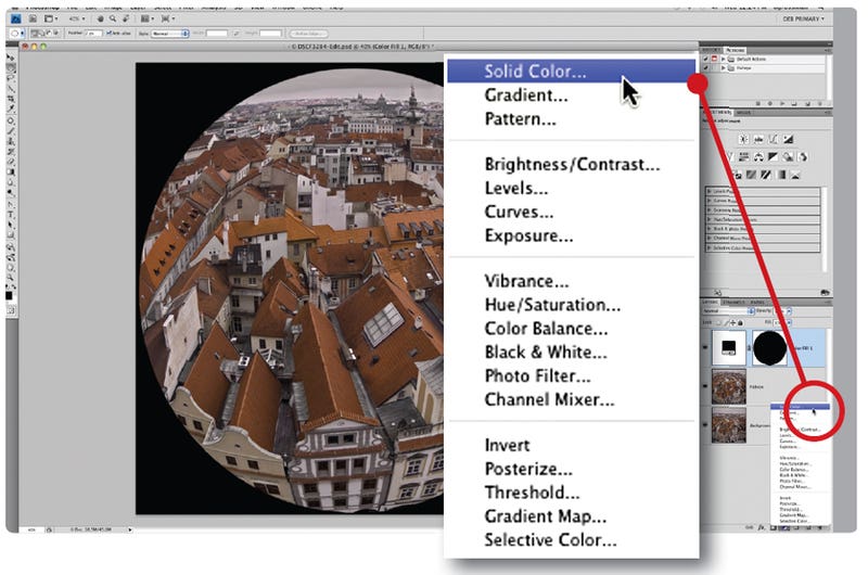 الآن، اعكس التحديد بالضغط على مفتاحي Control (Command على نظام Mac) + Shift + I على لوحة المفاتيح. سيضمن هذا أن يشمل التحديد كل شيء خارج الدائرة التي رسمتها للتو. من قائمة طبقة الضبط في أسفل لوحة الطبقات، اختر لونًا ثابتًا. حدد اللون الأسود من منتقي الألوان، ثم اضغط على موافق لمعاينة شكل الصورة بعدسة عين السمكة. ملاحظة: عند إنشاء طبقة ضبط جديدة وتحديد منطقة ما، يقوم فوتوشوب تلقائيًا بتحويل التحديد إلى قناع.