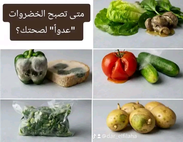 🧅🧄🥦🥬🥒🫑🥔🥕🍅 🛑 متى تصبح الخضروات “عدواً” لصحتك؟ (علامات لا تتجاهلها!) 🛑كثير منا يعتقد أن قطع الجزء التالف من الخضار يكفي، لكن الحقيقة قد تكون أخطر من ذلك. إليك دليلك السريع لمعرفة الخضروات التي يجب أن تغادر مطبخك فوراً:✅ 1. البطاطس “المخضرة” أو “المزرعة”:إذا بدأت تظهر نتوءات خضراء أو “زروع” على البطاطس، فهذا يعني ارتفاع مادة (السولانين). وهي سموم طبيعية قد تسبب الغثيان، الصداع، وآلام المعدة. (القطع لا يكفي دائماً إذا كان اللون الأخضر منتشراً!).✅ 2. الطبقة اللزجة (The Slime):هل لاحظت لزوجة على الخس، السبانخ، أو الفطر؟ هذه ليست رطوبة، بل هي مستعمرات بكتيرية بدأت في تحليل النبات. تناولها مغامرة غير محسوبة بجهازك الهضمي.✅ 3. العفن الظاهري (البقع القطنية):ظهور بقع بيضاء أو سوداء أو رمادية يعني أن “جذور” الفطريات تغلغلت في الداخل. الفطريات تفرز سموماً فطرية لا تُرى بالعين المجردة ولا تموت بالحرارة أحياناً.✅ 4. القوام الطري والرائحة الكريهة:عندما تصبح الطماطم أو الخيار طرية جداً لدرجة سيلان سوائل منها مع رائحة نفاذة، فهذا دليل على نشاط بكتيري متقدم. السوائل تنقل التلوث لكل أجزاء الثمرة بسرعة.✅ 5. انتفاخ المعلبات أو الأكياس:أي كيس خضروات مجمدة أو علبة بقوليات تبدو “منتفخة” هي بمثابة إنذار خطر! الانتفاخ يعني وجود غازات ناتجة عن بكتيريا قد تسبب تسمماً غذائياً حاداً.⚠️ القاعدة الذهبية: “عند الشك.. ارمِ الطعام”. صحتك أغلى من ثمن ثمرة خضار.💡 شارك المعلومات مع عائلتك وأصدقائك لتعم الفائدة!#الصيدلية_زراعية_دار_الفلاحة #الزراعة_حياة# مجلة ايليت فوتو ارت