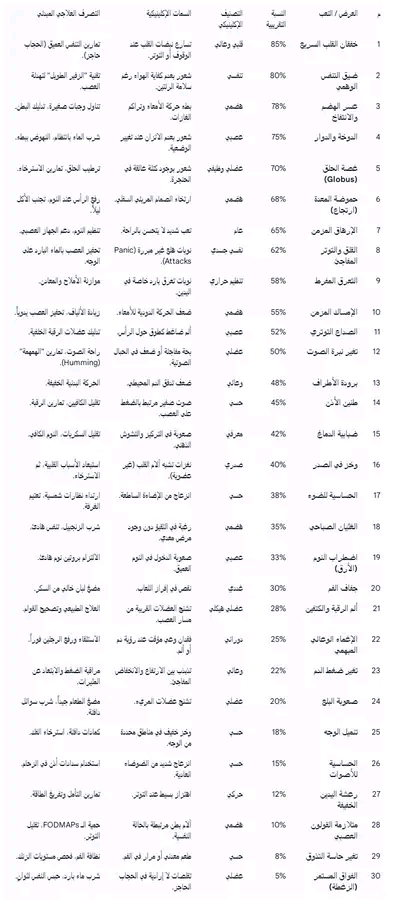 .العصب الحائر حكاية خلف كل باب تحت كل قميصلا يوجد انسان الا و قد حيره فعلا بالاتينية Vagus : يعني حرفياً “المتجول” المبهم أو (متشرد) و (غامض) .عندما يحدث فيه خلل و تهيج، تظهر مجموعة واسعة من الأعراض التي قد تبدو غير مترابطة للمريض من اول نبرة الصوت دقات القلب النفس وخز اعلى الراس دوخة ….. الخ حتى دخول الحمام و الخروج منه لا يتم الا باذن منه هنا 60 عرضاً وتعباً مرتبطاً بالعصب الحائر من الأكثر شيوعاً إلى الأقل … لا يوجد بشري الا اصيب لاباكتر من 5 او 6 منها على الاقل .*** ملاحظات هامة:طريقة التحفيز : تعتبر تمارين “التنفس البطني” (الشهيق 4 ثوانٍ والزفير 8 ثوانٍ) هي المعيار الذهبي المبدئي لتهدئة هذا العصب.الارتباط الجسدي النفسي: غالباً ما تزداد هذه الأعراض في فترات الضغط النفسي الحاد، مما يؤكد دور الجهاز العصبي الودي في التأثير على العصب الحائر..م,العرض / التعب,النسبة التقريبية,التصنيف الإكلينيكي,السمات الإكلينيكية,التصرف العلاجي المبدئي.1,خفقان القلب السريع,85%,قلبي وعائي,تسارع نبضات القلب عند الوقوف أو التوتر.,تمارين التنفس العميق (الحجاب حاجز)..2,ضيق التنفس الوهمي,80%,تنفسي,شعور بعدم كفاية الهواء رغم سلامة الرئتين.,”تقنية “”الزفير الطويل”” لتهدئة العصب.”.3,عسر الهضم والانتفاخ,78%,هضمي,بطء حركة الأمعاء وتراكم الغازات.,تناول وجبات صغيرة، تدليك البطن..4,الدوخة والدوار,75%,عصبي,شعور بعدم الاتزان عند تغيير الوضعية.,شرب الماء بانتظام، النهوض ببطء..5,غصة الحلق (Globus),70%,عضلي وظيفي,شعور بوجود كتلة عالقة في الحنجرة.,ترطيب الحلق، تمارين الاسترخاء..6,حموضة المعدة (ارتجاع),68%,هضمي,ارتخاء الصمام المريئي السفلي.,رفع الرأس عند النوم، تجنب الأكل ليلاً..7,الإرهاق المزمن,65%,عام,تعب شديد لا يتحسن بالراحة.,تنظيم النوم، دعم الجهاز العصبي.8,القلق والتوتر المفاجئ,62%,نفسي جسدي,نوبات هلع غير مبررة (Panic Attacks).,تحفيز العصب بالماء البارد على الوجه..9,التعرق المفرط,58%,تنظيم حراري,نوبات تعرق بارد خاصة في اليدين.,موازنة الأملاح والمعادن..10,الإمساك المزمن,55%,هضمي,ضعف الحركة الدودية للأمعاء.,زيادة الألياف، تحفيز العصب يدوياً..11,الصداع التوتري,52%,عصبي,ألم ضاغط كطوق حول الرأس.,تدليك عضلات الرقبة الخلفية..12,تغير نبرة الصوت,50%,عضلي,بحة مفاجئة أو ضعف في الحبال الصوتية.,”راحة الصوت، تمارين “”الهمهمة”” (Humming).”.13,برودة الأطراف,48%,وعائي,ضعف تدفق الدم المحيطي.,الحركة البدنية الخفيفة..14,طنين الأذن,45%,حسي,صوت صفير مرتبط بالضغط على العصب.,تقليل الكافيين، تمارين الرقبة..15,ضبابية الدماغ,42%,معرفي,صعوبة في التركيز والتشوش الذهني.,تقليل السكريات، النوم الكافي.16,وخز في الصدر,40%,صدري,نغزات تشبه آلام القلب (غير عضوية).,استبعاد الأسباب القلبية، ثم الاسترخاء.17,الحساسية للضوء,38%,حسي,انزعاج من الإضاءة الساطعة.,ارتداء نظارات شمسية، تعتيم الغرفة.18,الغثيان الصباحي,35%,هضمي,رغبة في التقيؤ دون وجود مرض معدي.,شرب الزنجبيل، تنفس هادئ.19,اضطراب النوم (الأرق),33%,عصبي,صعوبة الدخول في النوم العميق.,الالتزام بروتين نوم هادئ.20,جفاف الفم,30%,غددي,نقص في إفراز اللعاب.,مضغ لبان خالي من السكر.21,ألم الرقبة والكتفين,28%,عضلي هيكلي,تشنج العضلات القريبة من مسار العصب.,العلاج الطبيعي وتصحيح القوام.22,الإغماء الوعائي المبهمي,25%,دوراني,فقدان وعي مؤقت عند رؤية دم أو ألم.,الاستلقاء ورفع الرجلين فوراً.23,تغير ضغط الدم,22%,وعائي,تذبذب بين الارتفاع والانخفاض المفاجئ.,مراقبة الضغط والابتعاد عن المثيرات.24,صعوبة البلع,20%,عضلي,تشنج عضلات المريء.,مضغ الطعام جيداً، شرب سوائل دافئة.25,تنميل الوجه,18%,حسي,وخز خفيف في مناطق محددة من الوجه.,كمادات دافئة، استرخاء الفك.26,الحساسية للأصوات,15%,حسي,انزعاج شديد من الضوضاء العادية.,استخدام سدادات أذن في الزحام.27,رعشة اليدين الخفيفة,12%,حركي,اهتزاز بسيط عند التوتر.,تمارين التأمل وتفريغ الطاقة.28,متلازمة القولون العصبي,10%,هضمي,آلام بطن مرتبطة بالحالة النفسية.
