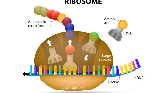 • يتم اتحاد فرعين من الريبوسومات حول بوليمرات رنا المرسال (mRNA)، حتى يتم تخليق البروتينات عن طريق نقل الحمض النووي الريبي.