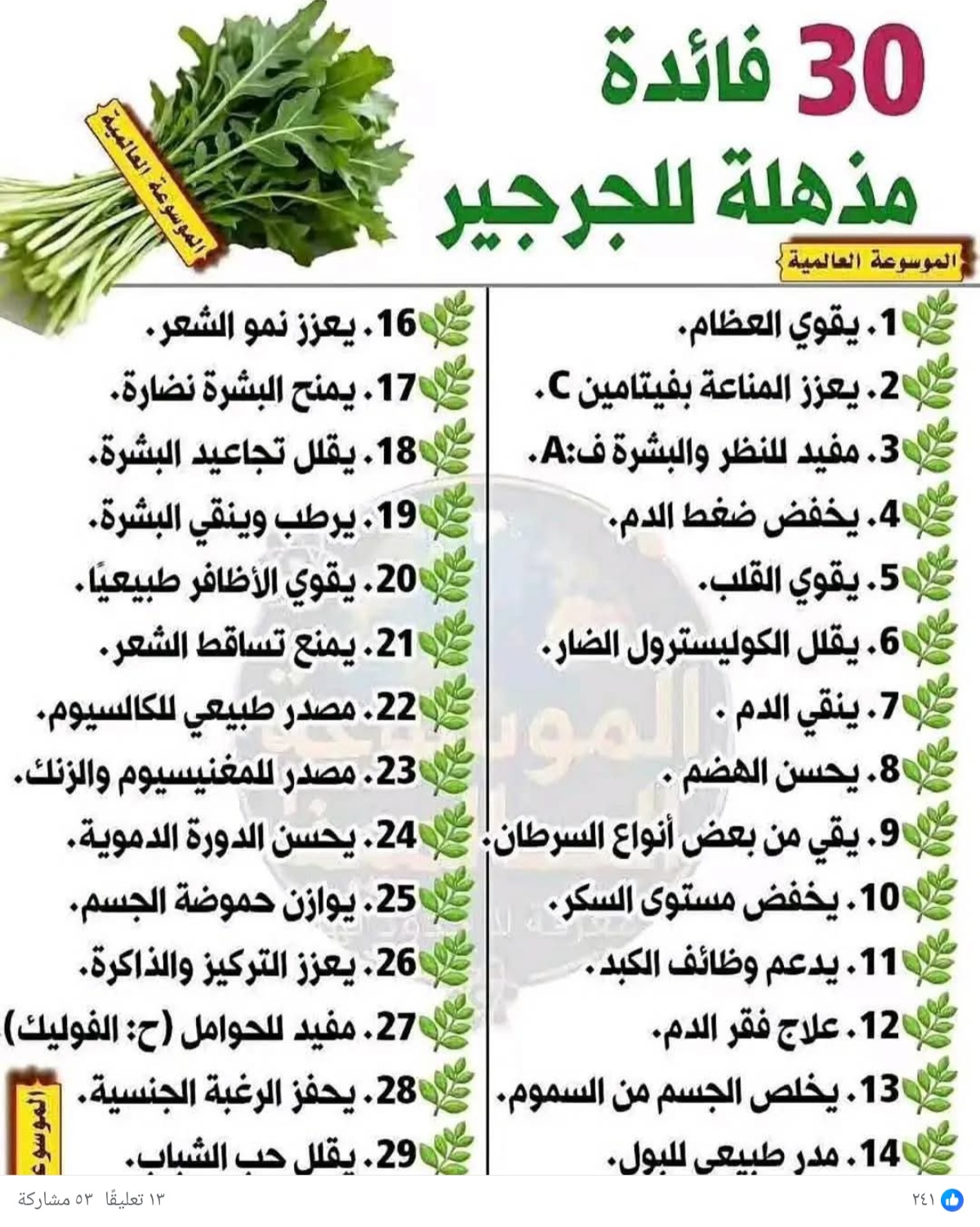 — الجرجير الغني بفيتامين C ومضادات الأكسدة يقوي المناعة ويحمي الجسم من الأمراض عند تناوله بانتظام. تحارب مضادات الأكسدة الجذور الحرة في الجسم ..
