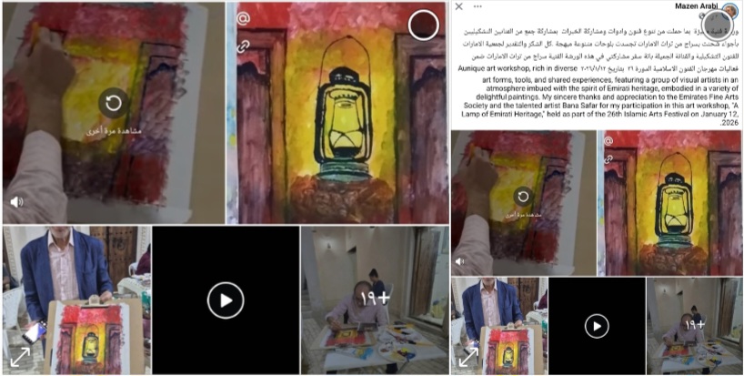 ورشة فنية مميزة بما حملت من تنوع فنون وادوات ومشاركة الخبرات بمشاركة جمع من الفنانين التشكيليين بأجواء شحنت بسراج من تراث الامارات تجسدت بلوحات متنوعة مبهجة .كل الشكر والتقدير لجمعية الامارات للفنون التشكيلية والفنانة الجميلة بانة سفر مشاركتي في هذه الورشة الفنية سراج من تراث الامارات ضمن فعاليات مهرجان الفنون الاسلامية الدورة ٢٦ بتاريخ ٢٠٢٦/١/١٢ Aunique art workshop, rich in diverse art forms, tools, and shared experiences, featuring a group of visual artists in an atmosphere imbued with the spirit of Emirati heritage, embodied in a variety of delightful paintings. My sincere thanks and appreciation to the Emirates Fine Arts Society and the talented artist Bana Safar for my participation in this art workshop, “A Lamp of Emirati Heritage,” held as part of the 26th Islamic Arts Festival on January 12, 2026.