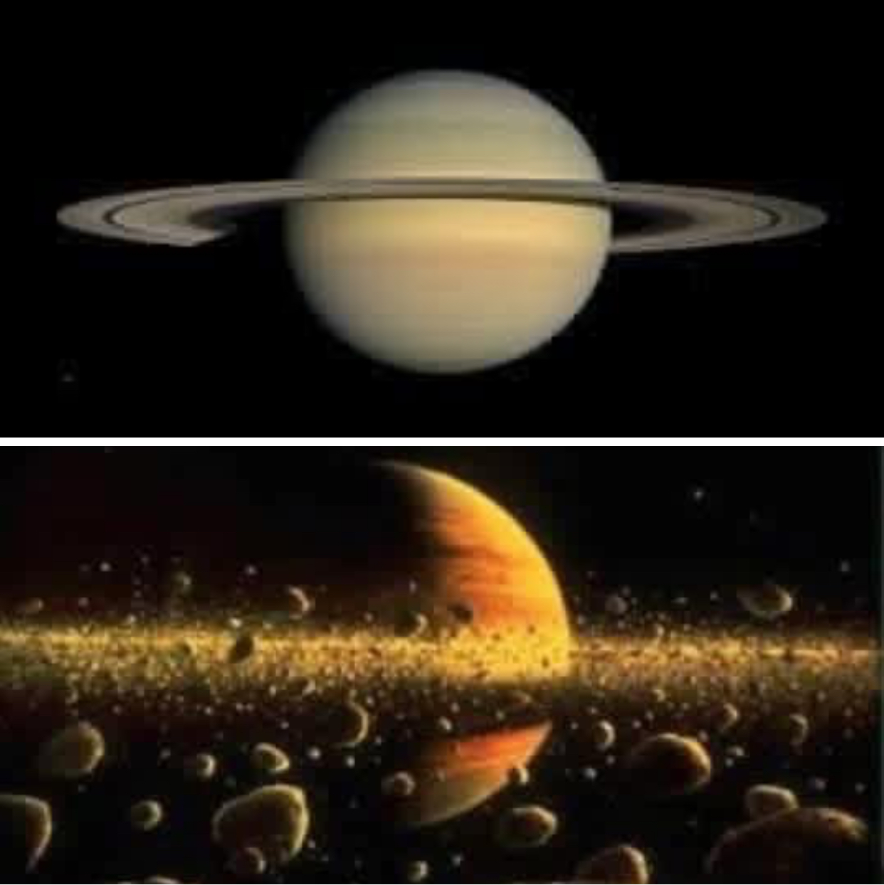 تخيل أن تتجول على الطبقة الخارجية لكوكب زحل الغازي. سترى عندها المنظر المهيب للحلقات المحيطة بالكوكب عاليا فوق رأسك على بعد 75 ألف كيلومتراً والتي تعكس ضوء الشمس بما انها مكونة في غالبها من الماء المتجمد وذرات الغبار حيث يتراوح حجم هذه الجسيمات من بضعة أجزاء من مليون من المتر وحتى بضعة أمتار في أبعادها.