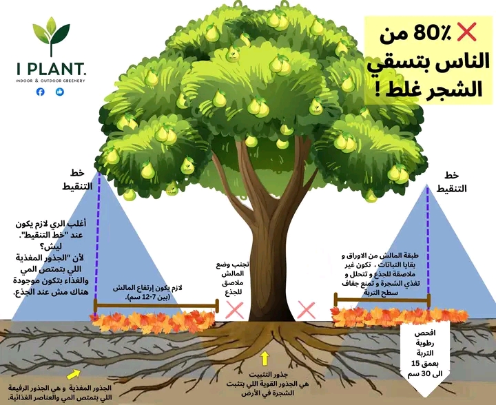 🌳 أكبر خطأ بالري… إنك تسقي عند الجذع من أكثر الأخطاء اللي بتتكرر بالمزارع والحدائق 👇كثير ناس بتسقي المي وتغمر الساق وبتقول:”خلص… هيك الشجرة شربت ✔”بس السؤال:هل وصلت المي للجذور الماصة ؟ 🤔……..🔎 وين بتم الامتصاص فعليا ” شوف الصورة ” ؟✔ الجذور الماصة تتركز غالبا عند محيط ظل الشجرة (خط التنقيط).✔ في جذور قريبة من الساق، لكن كثافتها ونشاطها أقل.✔ أفضل امتصاص بيكون في تربة مهواة وغير مشبعة دائما بالماء.يعني؟الري لازم يكون موزع… مش نقطة وحدة ثابتة دائما ………💧 هل الري عند الجذع غلط ؟❌ مش غلط مطلقا.لكن الغلط إنك تركز كل الري هناك باستمرار ، بدون توزيع على باقي مساحة الجذور.هذا ممكن يسبب:– جذور سطحية وضعيفة– سوء تهوية– أعفان القاعدة و الجذع – امراض اكثر – نمو غير متوازن……..🌱 والمالش ؟✔ يحافظ على الرطوبة✔ يقلل التبخر ” خاصة في الصيف “✔ يغذي و يحسن بنية التربةلكن اترك مسافة 5–10 سم بعيد عن الجذعحتى ما ترفع الرطوبة المباشرة حولها………📌 القاعدة :كلما كبرت الشجرة ؟ كبر معها نطاق الري.والمي لازم توصل للمكان الصح تحت التربة.وين بتحط نقطة المي عندك ؟ 💚#إدارة_الري #الزراعة_الذكية #تغطية_التربة #أخطاء_زراعية #العناية_بالأشجار # الزراعة البسيطة# مجلة ايليت فوتو ارت