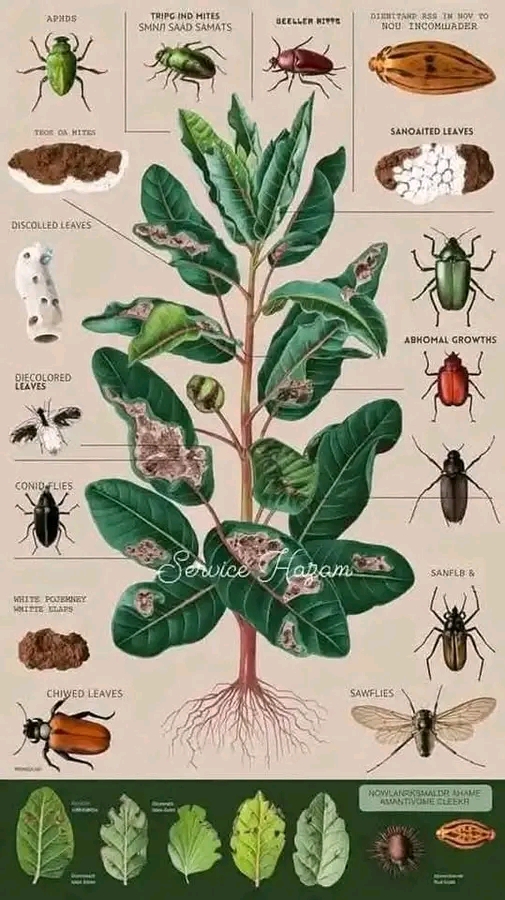 *مكافحة آفات وأمراض النباتات: دليل شامل*النباتات تواجه العديد من الآفات والأمراض التي يمكن أن تلحق بها أضرارًا جسيمة. فهم الأنواع المختلفة من هذه الآفات والأمراض وكيفية مكافحة كل منها يمكن أن يساعد في الحفاظ على صحة النباتات وزيادة إنتاجيتها. الصورة التي لدينا توضح مجموعة من الآفات والأمراض الشائعة التي تصيب النباتات، إلى جانب الأضرار التي تسببها.*أنواع الآفات والأمراض وأعراضها:*1. *المن (Aphids)*: – *الأعراض*: تظهر على الأوراق بقع صفراء أو تشوهات، وتتواجد الحشرات الصغيرة على السطح السفلي للأوراق. – *المكافحة*: يمكن استخدام المبيدات الحشرية الطبيعية أو الزراعية، أو الاستفادة من الأعداء الطبيعية مثل الدعسوقة.2. *العرق (Thrips)*: – *الأعراض*: بقع فضية أو بيضاء على الأوراق، وأحيانًا بقع بنية. – *المكافحة*: يمكن استخدام المبيدات الحشرية أو الحفاظ على صحة النبات لتحمل العرق.3. *العناكب (Mites)*: – *الأعراض*: تظهر نقاط صفراء أو بنية صغيرة على الأوراق، وتصبح الأوراق مشوهة أو ملتفة. – *المكافحة*: يمكن استخدام مبيدات العناكب الطبيعية أو الكيميائية.4. *اليرقات (Beetle larvae)*: – *الأعراض*: يمكن رؤية اليرقات على الأوراق والأغصان، وتسبب تقشير الأوراق وثقوب فيها. – *المكافحة*: إزالة اليرقات يدويًا أو استخدام المبيدات الحشرية.5. *الأوراق المتغيرة اللون (Discoloured leaves)*: – *الأعراض*: تغير لون الأوراق إلى الأصفر أو البني، وقد يكون ذلك بسبب نقص العناصر الغذائية أو الأمراض الفطرية. – *المكافحة*: فحص التربة وتوفير العناصر الغذائية اللازمة، واستخدام مبيدات الفطريات إذا لزم الأمر.*أنواع أخرى من الأضرار وأسبابها:*- *النمو غير الطبيعي (Abnormal growths)*: قد يكون سببه الأمراض الفيروسية أو الفطرية.- *وجود الأتربة والنمل على النباتات*: قد يكون مؤشرًا على وجود حشرات معينة تنجذب إلى العصارات النباتية.*كيفية مكافحة هذه الآفات والأمراض*1. *الفحص الدوري*: قم بفحص النباتات بانتظام للكشف عن أي علامات للإصابة واتخاذ الإجراءات اللازمة بسرعة.2. *استخدام المبيدات المناسبة*: اختر المبيدات المناسبة لكل نوع من الآفات أو الأمراض وتأكد من اتباع التعليمات بدقة.3. *الزراعة البيولوجية*: الاستفادة من الأعداء الطبيعية مثل الحشرات النافعة التي تتغذى على الآفات.4. *الصحة العامة للنباتات*: الحفاظ على صحة النباتات من خلال التسميد الجيد، الري المناسب، والتقليم.*الخلاصة*الحفاظ على صحة النباتات يتطلب فهماً جيداً للآفات والأمراض الشائعة وكيفية مكافحتها بفعالية. باستخدام الطرق المناسبة والاهتمام الدوري، يمكن الحفاظ على نباتاتك صحية ومنتجة.اسمده#معلقات #زراعه#زراعة#أسمده#أسمده#اسمده_زراعية#أسمدة_زراعيه#فايتر_للاسمده#فايتر#مبيدات_زراعيه#مبيدات_زراعية #مكافحه_زراعيه #الزراعة #العناية_بالنباتات #الزراعة_العضوية #نصائح_زراعية #السماد #التربة #العناصر_الغذائية #مغذيات #مبيدات_فطريه#مبيدات_حيويه#مبيدات_حشريه #الزراعيه #كيماويات_زراعيه# مجلة ايليت فوتو ارت