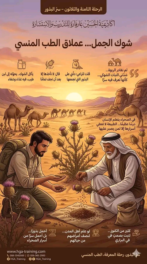 شوك الجمل… عملاق الطب المنسي الرحلة الثامنة والثلاثون – سرّ البذور لم نغادر الربوة مباشرة بعد حديثنا مع الراعي، فقد شدّني ذلك النبات الشوكي الذي كانت الجمال تلتهمه بنهمٍ عجيب، كأنها تعرف فيه سرًا لا نعرفه نحن.اقتربت من إحدى الشجيرات، وكانت قائمة كجنديٍّ يحرس الصحراء؛ ساقها قوية، وأوراقها قاسية، وشوكها حادّ كالإبر. ومع ذلك كانت الجمال تأكلها بلا تردد.قلت للراعي:”دلّني على البذور التي تجمعها.”فأخذني إلى أطراف الوادي حيث كانت بعض النباتات قد جفّت بعد موسمها. انحنى، وأخذ يهزّ رؤوسها اليابسة فوق قطعة قماش، فتساقطت منها بذور صغيرة بنية اللون.قال وهو يجمعها بكفّه:”لا نأخذها إلا بعد أن تجف تمامًا، فحينها تكون قد جمعت قوتها كلها.”أخذت حبة بين أصابعي أتأملها. صغيرة جدًا… لكنني تذكرت قول الحكماء:”كم من دواء عظيم أودعه الله في حبة صغيرة.”قلت للراعي:”هل يأخذها غيرك من أهل البادية؟”قال:”قليل من الناس يفعلون. أكثرهم يكتفون بأن تأكلها الجمال، ثم يشربون لبنها، فينتفعون بها من غير أن يشعروا.”ثم أشار إلى القطيع وقال:”انظر إلى الجمل… يأكل الشوك الذي لا تقدر عليه بقية الدواب، ثم يحوّله إلى لبن طيب، فيه غذاء وشفاء.”جلست على صخرة قريبة وأنا أتأمل كلامه. في الصحراء يتعلم الإنسان درسًا عظيمًا:أن الطبيعة لا تعطي أسرارها إلا لمن يصبر عليها.قلت للراعي:”لو علم أهل المدن بما في هذه النباتات من قوة، لبحثوا عنها كما يبحثون عن الذهب.”فضحك وقال:”لو جاء أهل المدن إلى هنا يومًا واحدًا لعادوا إلى طباعهم القديمة… الطعام البسيط، والحركة، والنوم المبكر. نصف أمراضهم من حياتهم لا من أجسادهم.”كلماته كانت كالسهم يصيب الحقيقة.وقبل أن نفترق، أخذ حفنة من البذور ووضعها في يدي وقال:”خذها معك في رحلتك، فلعلها تنفعك… أو تنفع من بعدك.”وضعتها في كيسي وأنا أشعر أنني لا أحمل بذورًا فقط… بل أحمل سرًا من أسرار الصحراء.ثم ركبنا طريقنا من جديد، وكانت الشمس تميل إلى المغيب، والجمال تسير ببطء خلف الراعي، كأنها تعرف أن الليل قادم.وفي تلك اللحظة أدركت أمرًا عجيبًا:أن كثيرًا من الكنوز التي يبحث عنها الناس في المختبرات… تنبت بصمتٍ في البراري.وكان شوك الجمل واحدًا من تلك الكنوز المنسية#منقول من صفحة المربد# مجلة ايليت فوتو ارت