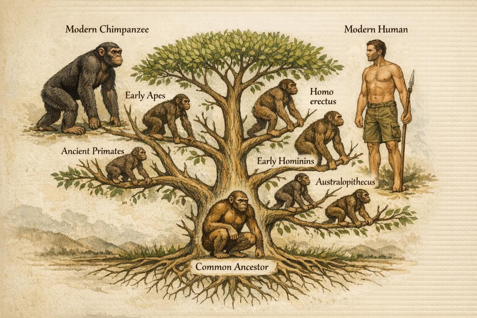 حسب نظرية التطوّر، نحن والقرود لا ننحدر من بعضنا البعض، بل نشترك في سلفٍ مشترك عاش قبل ملايين السنين.التطوّر لا يعمل كسلّم نصعده من الأدنى إلى الأعلى، بل كشجرة تتفرّع حسب الظروف البيئية.كل فرع يتغيّر بالطريقة التي تساعده على البقاء في بيئته.بعض الفروع أدّت إلى الإنسان بسبب تغيّر البيئة، المشي على قدمين، استخدام الأدوات، وتطوّر اللغة.فروع أخرى أدّت إلى القرود الحالية لأنها كانت —ولا تزال— ناجحة في بيئاتها، فلم يكن هناك ضغط تطوّري يدفعها لتصبح شيئًا آخر.لذلك القرود لم “تتأخر” في التطوّر، بل تطوّرت في اتجاه مختلف، مثلما تطوّرت أنواع أخرى بطرق مختلفة.التطوّر لا يسعى لصناعة الإنسان، بل لصناعة كائن قادر على البقاء # اصل الانسان# مجلة تيليت فوتو ارت