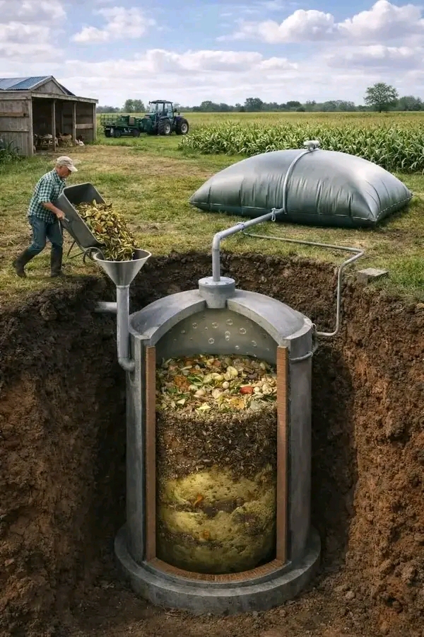 🟢 ماذا لو كان بإمكان مخلفات حيوانات المزرعة أن تُدفّئ منزلك، وتُطهى بها طعامك، وتُقلّل التلوث في الوقت نفسه؟هذا بالضبط ما توضحه الصورة أعلاه: نظام بيوغاز زراعي صغير، حيث يتم إدخال روث الحيوانات والمخلفات العضوية إلى خزان هضم تحت الأرض. داخل هذا الخزان، تقوم بكتيريا طبيعية بتفكيك المواد العضوية وتُطلق غازًا غنيًا بالميثان، يتم جمعه ثم نقله عبر أنابيب إلى مطبخ المزرعة.هذه التقنية ليست خيالًا علميًا. إنها واحدة من أكثر حلول الطاقة المتجددة عملية في المناطق الريفية، وهي مستخدمة بالفعل على نطاق واسع في أجزاء من آسيا وإفريقيا وأوروبا.🔻 ما هو هاضم البيوغاز؟هاضم البيوغاز هو حاوية مغلقة تتحلل فيها المخلفات العضوية في بيئة خالية من الأكسجين. تُسمّى هذه العملية الهضم اللاهوائي.أثناء الهضم، تقوم الكائنات الحية الدقيقة بتفكيك المخلفات وتنتج:البيوغاز (يتكوّن أساسًا من الميثان وثاني أكسيد الكربون)المخلفات المهضومة (Digestate)، وهي مادة سائلة/طينية غنية بالعناصر الغذائية يمكن استخدامها كسمادبهذا الشكل، يحوّل النظام مشكلة النفايات إلى مورد للطاقة.🔻 شرح مكونات النظام الظاهرة في الصورة1️⃣ مدخل المخلفات (روث + مواد عضوية)على الجانب الأيسر، يظهر مزارع يُدخل المخلفات عبر فتحة على شكل قمع. وتظهر الأبقار و الاغنتم كمصادر نموذجية للمواد الخام.تشمل المدخلات الشائعة:روث الأبقارروث الاغناممخلفات الدواجن (في بعض الأنظمة)بقايا الطعامبقايا المحاصيلمخلفات الخضروات2️⃣ خزان الهضم تحت الأرضفي وسط الصورة، يظهر خزان كبير تحت الأرض مملوء بالمواد العضوية المتحللة.هذا التصميم ذكي لأنه:يحمي الخزان من تقلبات الحرارةيقلل الروائحيوفر المساحةيحافظ على استقرار وأمان النظامداخل الخزان، تقوم البكتيريا بتفكيك المخلفات ببطء، مع إطلاق فقاعات الغاز.3️⃣ أنبوب خروج الغازفي أعلى الهاضم يوجد أنبوب ينقل غاز البيوغاز من الخزان إلى منطقة التخزين ثم إلى المنزل.4️⃣ كيس تخزين الغازعلى سطح الأرض يظهر كيس كبير منتفخ لتخزين البيوغاز.عندما يكون إنتاج الغاز مرتفعًا يتمدد الكيس، وعند استخدام الغاز ينكمش.هذه طريقة بسيطة ومنخفضة التكلفة تجعل النظام مناسبًا للمزارع.5️⃣ خط الغاز إلى المطبختُظهر الصورة أنبوبًا ينقل الغاز من كيس التخزين إلى المنزل لتشغيل موقد الطبخ.ومن أهم مزايا البيوغاز أنه يمكن أن يحل مباشرة محل:غاز البروبانالفحمالحطبوحتى جزء من استهلاك الكهرباء6️⃣ مخرج المخلفات المهضومة (السماد)رغم أنه غير مبرز كثيرًا في الصورة، إلا أن كل أنظمة البيوغاز تنتج مادة متبقية بعد الهضم.هذه المادة قيّمة جدًا لأنها تُستخدم كـ:سماد زراعيمحسّن للتربةمكمّل للكمبوستوغالبًا ما تكون أقل رائحة من الروث الخام وأسهل في الاستعمال.🔵 لماذا يُعد البيوغاز ثورة حقيقية في المزارع؟تُعالج هاضمات البيوغاز عدة مشاكل في وقت واحد:✅ 1️⃣ طاقة متجددةتنتج المزرعة وقودها الخاص وتقلل الاعتماد على مصادر الطاقة الخارجية.✅ 2️⃣ إدارة المخلفاتتتحول المخلفات العضوية من ملوثات مزعجة إلى مدخلات منظمة ومفيدة.✅ 3️⃣ تقليل الروائحالهضم داخل نظام مغلق يمنع التحلل المكشوف وانتشار الروائح.✅ 4️⃣ طبخ أنظفبدل مواقد الحطب المليئة بالدخان، يوفر البيوغاز لهبًا نظيفًا ويحسّن جودة الهواء داخل المنازل.✅ 5️⃣ إنتاج سماديوفر السماد المهضوم عناصر غذائية مثل النيتروجين والفوسفور والبوتاسيوم، مما يعزز الاكتفاء الذاتي للمزرعة.🔻 الفوائد البيئيةلهذه التقنية فوائد بيئية كبيرة:🌍 تقليل انبعاث الميثان في الغلاف الجويالروث يطلق الميثان طبيعيًا عند تركه مكشوفًا، بينما يقوم الهاضم باحتجاز هذا الغاز واستخدامه كوقود.🌱 تقليل إزالة الغاباتفي المناطق التي تعتمد على الحطب، يقلل البيوغاز من الحاجة لقطع الأشجار.♻️ اقتصاد دائريأنظمة البيوغاز مثال مثالي للزراعة الدائرية:حيوانات → مخلفات → طاقة → سماد → محاصيل → علف → حيوانات🔻 التحديات واعتبارا