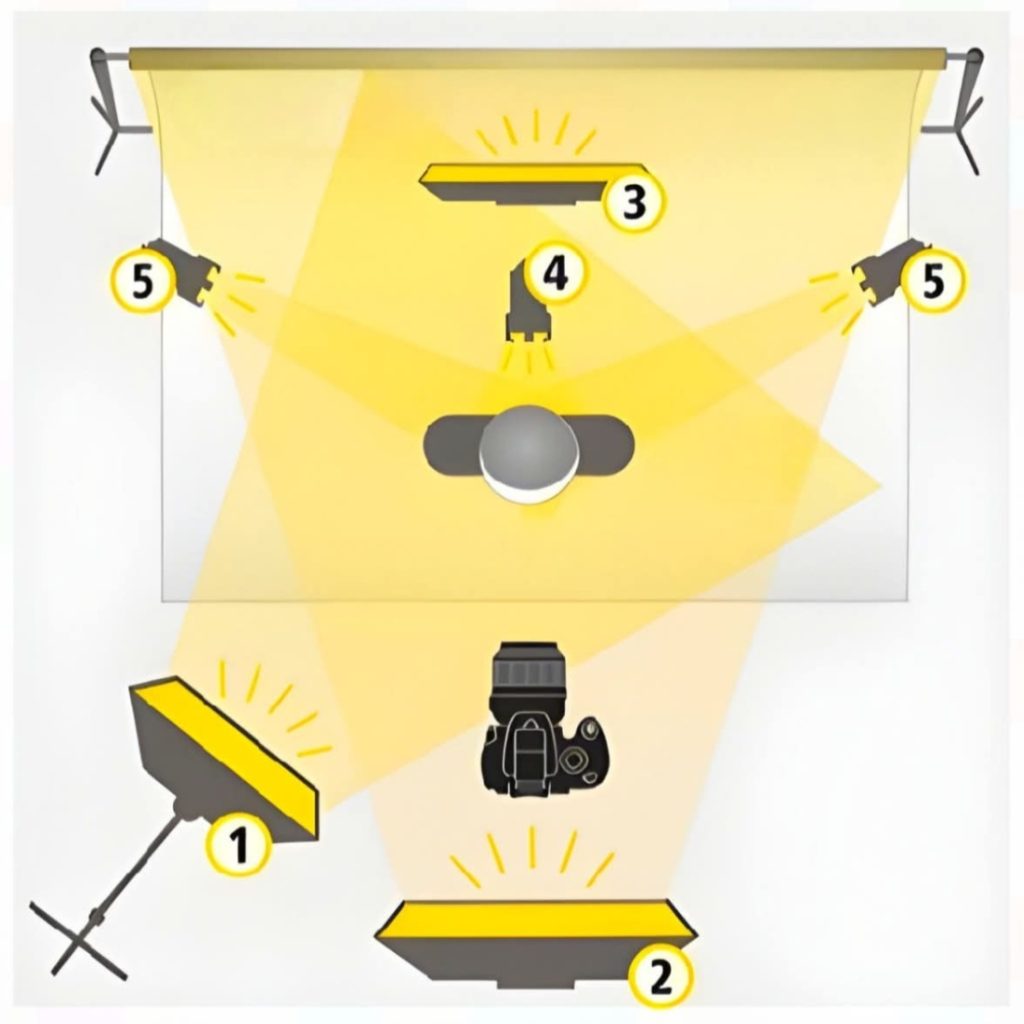 الصورة دي بتشرح إضاءة الاستوديو كأنها خريطة لعب